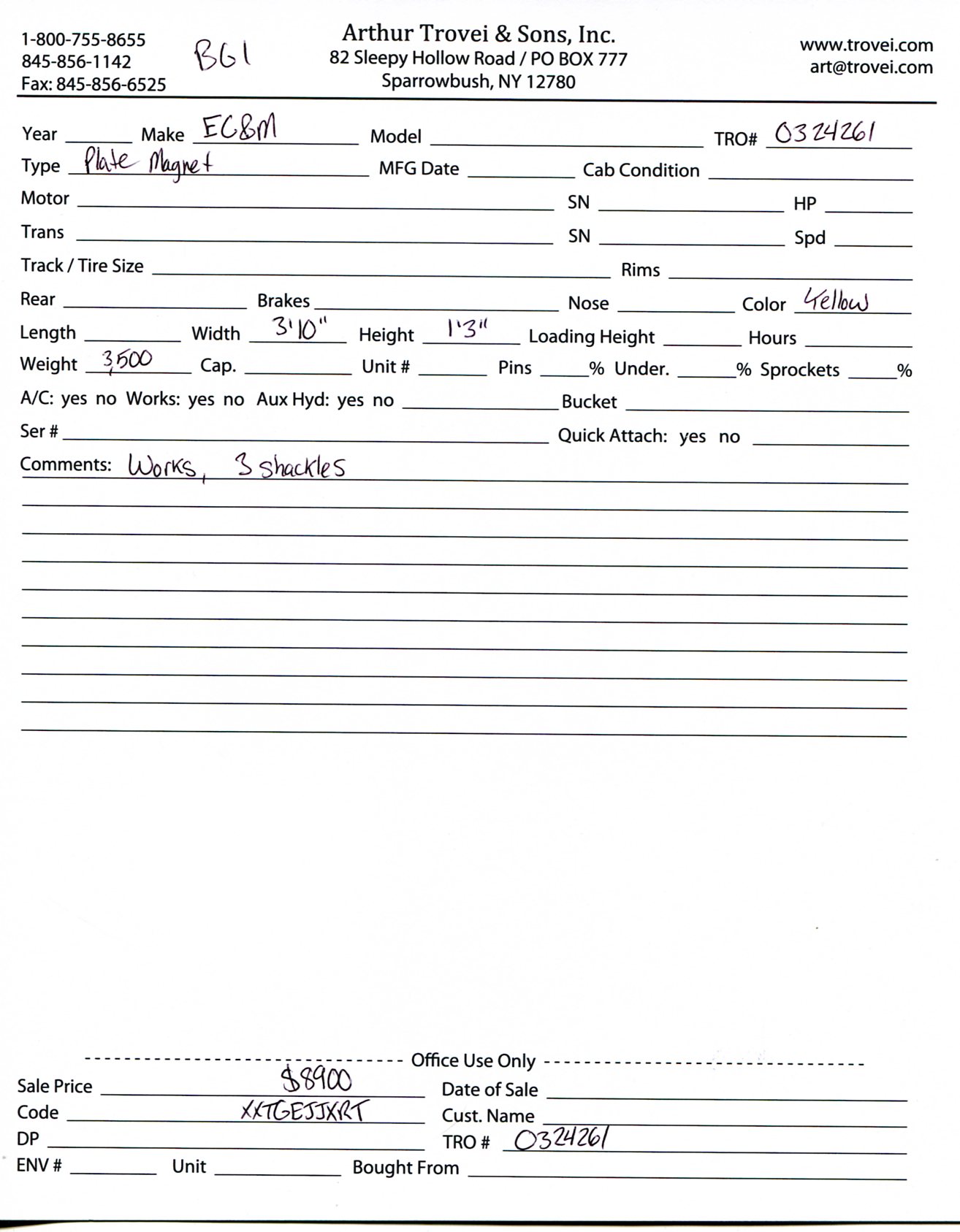 Inventory # 0324261Make: EC&M (Electric Controller and Manufacturing Co) Model # Type Plate Magnet Width: 3'10" Height: 1'3" Weight: 3,500 lb Added Details: 3 Shackles, Works Price: $8,900 BG1XXTGEJJXRT Terms of Sale
