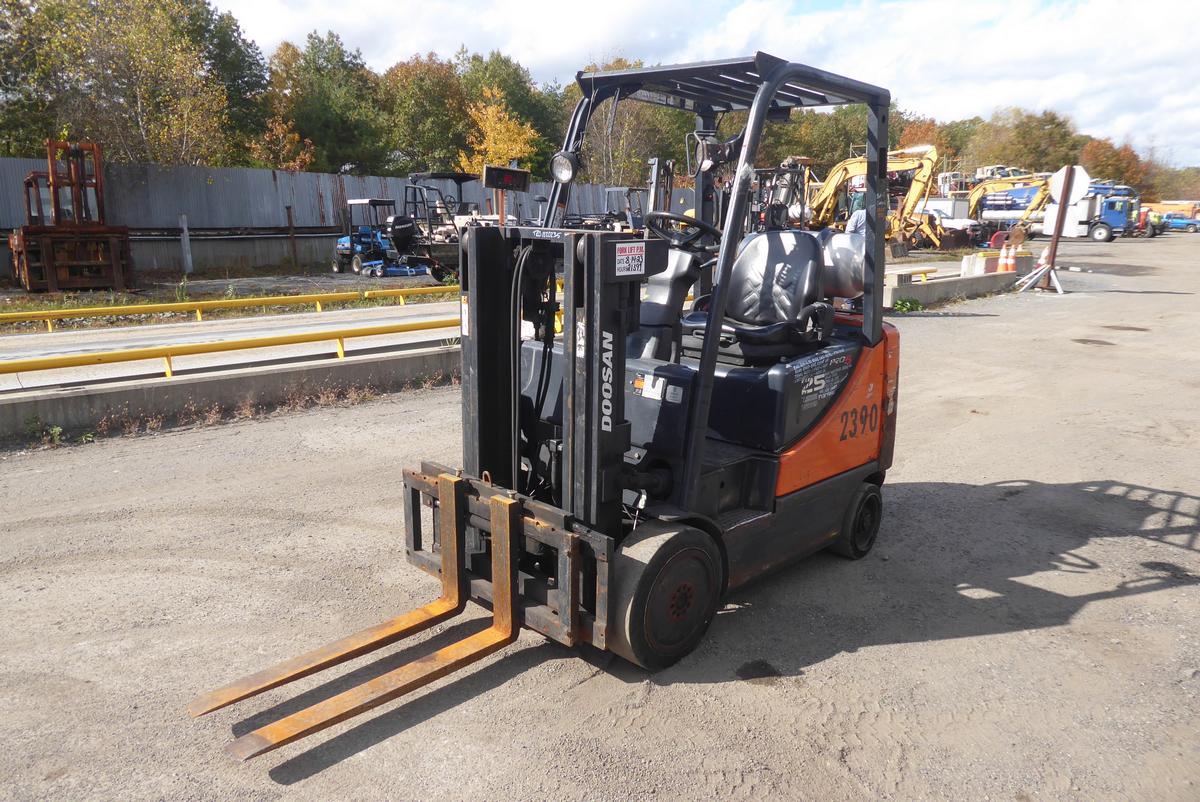 Inventory # 1020235Year: 2014 Make: Doosan Model: GC25P-5 Type: Forklift Serial # FGA0R-1290-00642 Motor: GM 2.4L 4 cylinder elec Propane - propane tank not included Transmission: Automatic - 1 forward 1 reverse Tires: 21x7x15 front - 16x5x10.5 rear solid - 10 Bolt Hour Reading: 21,563 Length w/o forks: 7'5" Width: 3'5" Height: 7'1" Loading Height: 80" Weight: 8,020 lbs Capacity: 3,900 lbs Fork Details: 4" W x 38" L x 1.5" Thick Added Details: Runs and works well - engine light on, one tilt cylinder has minor seepage, double mast, 5 degrees of back tilt, hydraulic side shift Price: Sold 1YDXXTBIJJXXTRQRTVDPAJJJXRT+750+250 Print This Page | Back to Forklift Inventory | Ask A Question Terms of Sale