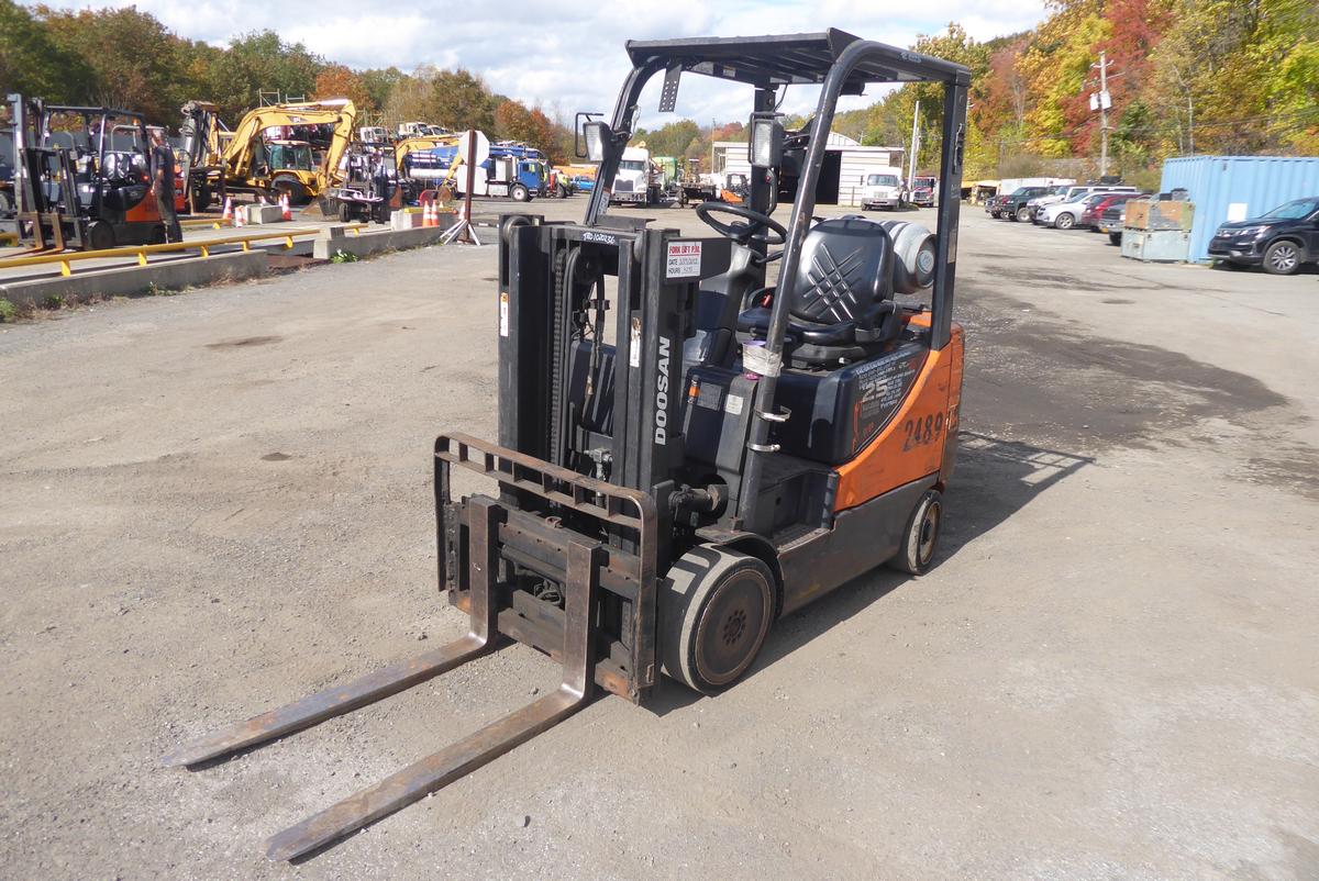 Inventory # 1020236Year: 2014 Make: Doosan Model: GC25P-5 Type: Forklift Serial # FGA0R-1290-00640 Motor: GM 2.4L 4 cylinder elec Propane - propane tank not included Transmission: Automatic - 1 forward 1 reverse Tires: 21x7x15 front - 16x5x10.5 rear solid - 10 Bolt Hour Reading: 395* NAH, 17,124 per prior owner Length w/o forks: 7'5" Width: 3'5" Height: 7'1" Loading Height: 80" Weight: 8,080 lbs Capacity: 3,900 lbs Fork Details: 4" W x 41" L x 1.5" Thick Added Details: Runs and works well - engine light on, all cylinders dry, double mast, 5 degrees of back tilt, hydraulic side shift Price: Sold 1YDXXTCEJJXXTRQRTVDPDEJXRT+750+250 Print This Page | Back to Forklift Inventory | Ask A Question Terms of Sale