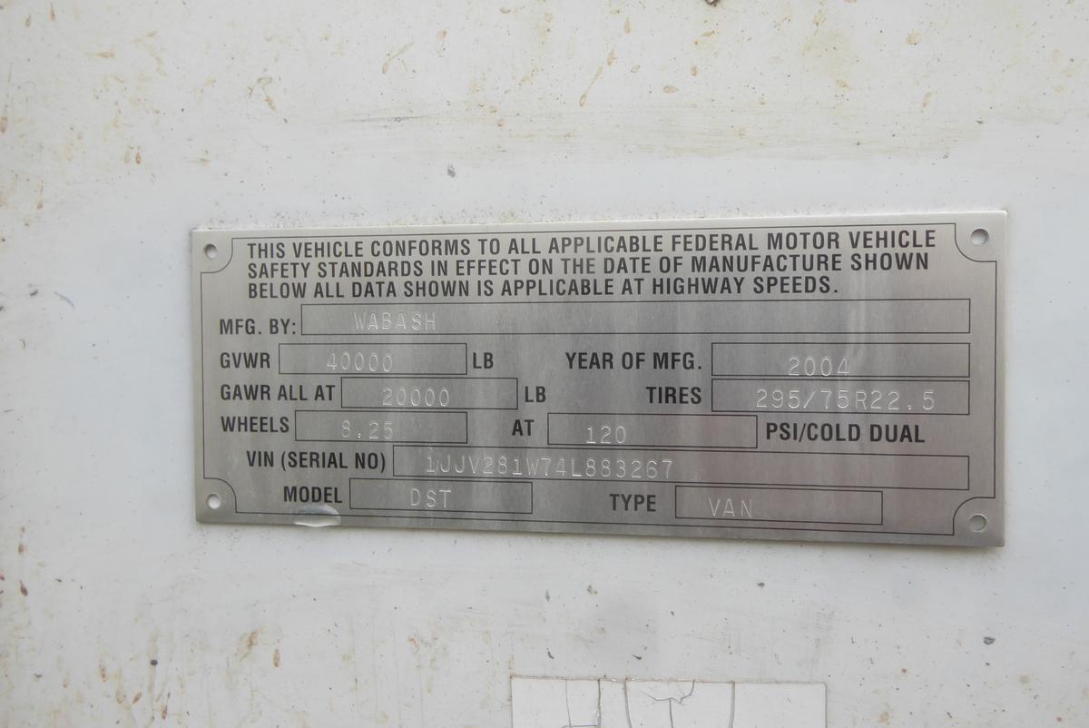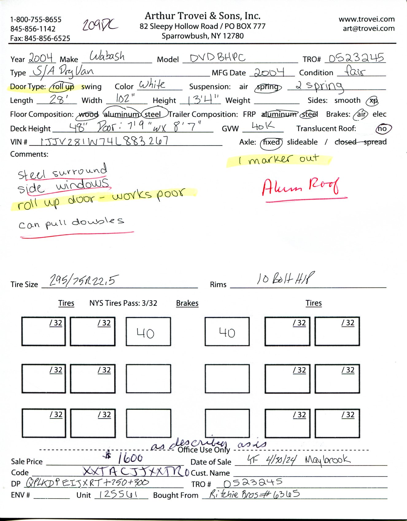 Inventory # 0523245Year: 2004 Make: Wabash Model: DVDBHPC Axles: Fixed Single Type: Dry Box Trailer VIN: 1JJV281W74L883267 Suspension: 2 Spring Tires: 275/80R22.5 / 295/75R22.5 Rims: 10 Bolt Hub Pilot - Steel Length: 28' Width: 102" Height: 13'4" Weight (Estimated): 8,920 lb GVW: 40,000 lb Floor Composition: Wood / Steel / Aluminum Trailer Composition: Aluminum / Steel Door Type: Roll Up - Steel Surround (Works Poor) Door Opening Width: 7'9" Door Opening Height: 8'7" Added Details: Air Brakes, Can Pull Doubles, Aluminum Roof, Side Windows, Vertical Logistics, Some Aluminum Crossmembers Price: $1,600 as is as described 209DCXXTACJJXXTQRTVDPEIJXRT+750+300 Terms of Sale