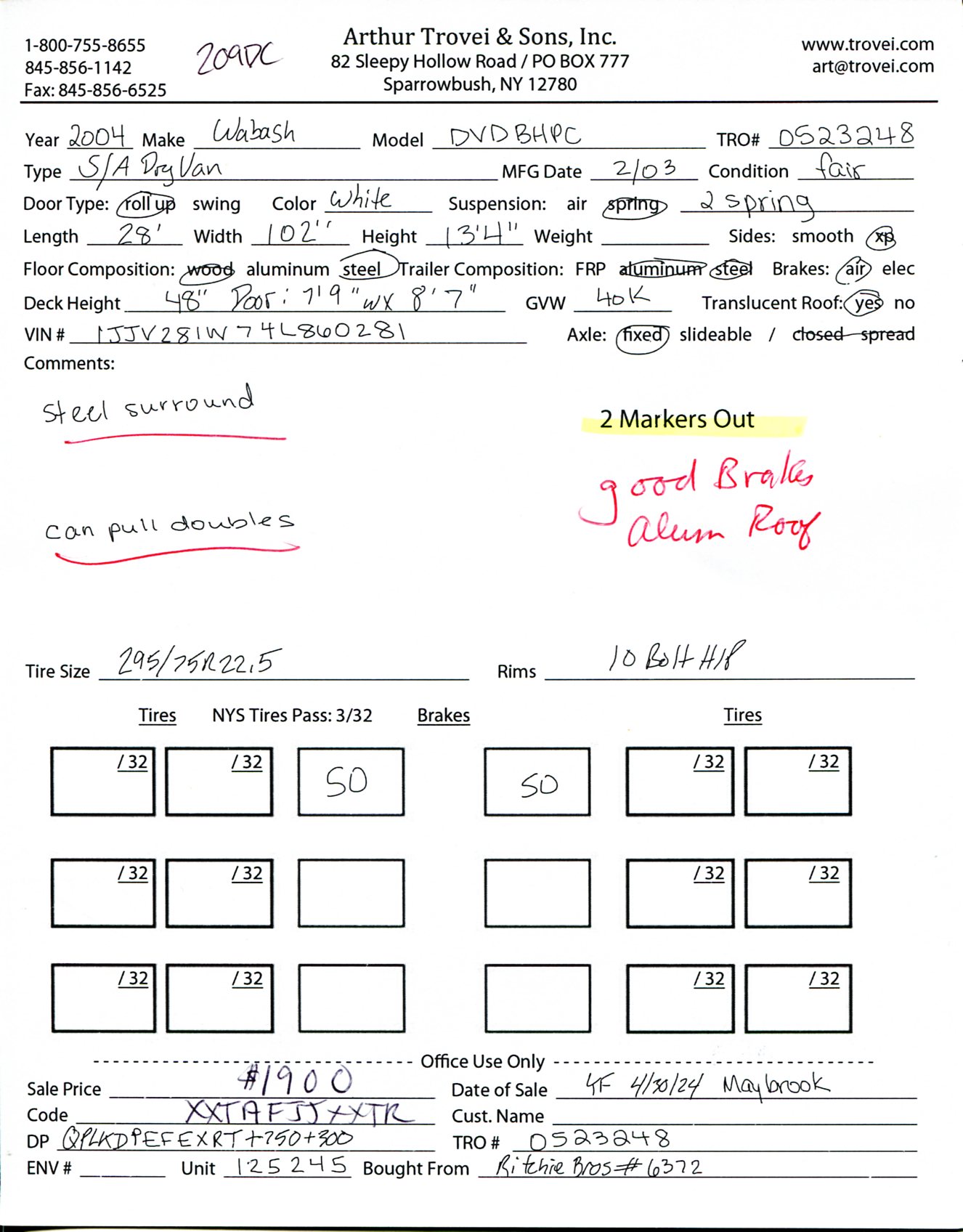 Inventory # 0523248Year: 2004 Make: Wabash Model: DVDBHPC Axles: Fixed Single Type: Dry Box Trailer VIN: 1JJV281W74L860281 Suspension: 2 Spring Tires: 275/80R22.5 / 295/75R22.5 Rims: 10 Bolt Hub Pilot - Steel Length: 28' Width: 102" Height: 13'4" Weight (Estimated): 8,920 lb GVW: 40,000 lb Floor Composition: Wood / Steel Trailer Composition: Aluminum / Steel Door Type: Roll Up - Steel Surround Door Opening Width: 7'9" Door Opening Height: 8'7" Added Details: Air Brakes, Can Pull Doubles, Translucent Roof, Vertical Logistics, Some Aluminum Crossmembers Price: $1,900 209DCXXTAFJJXXTQRTVDPEFEXRT+750+300 Terms of Sale