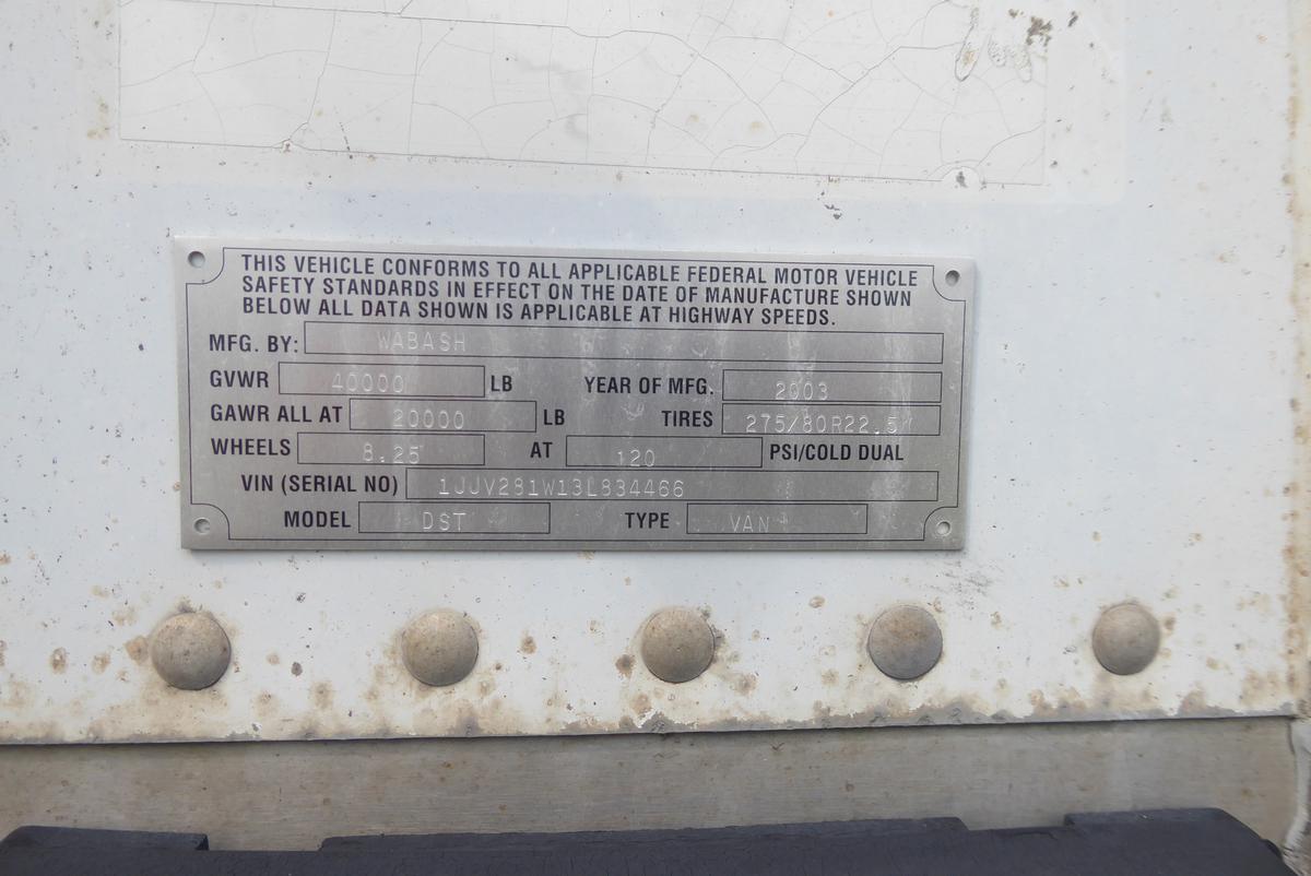 Inventory # 0524247Year: 2003 Make: Wabash Model: DVDBHPC Axles: Fixed Single Type: Dry Box Trailer VIN: 1JJV281W13L834466 Suspension: 2 Spring Tires: 295/75R22.5 Rims: 10 Bolt Hub Pilot - Steel Length: 28' Width: 102" Height: 13'4" Weight (Estimated): 8,920 lb GVW: 40,000 lb Floor Composition: Wood / Steel Trailer Composition: Aluminum / Steel Door Type: Roll Up - Steel Surround Door Opening Width: 7'9" Door Opening Height: 8'7" Added Details: Air Brakes, Can Pull Doubles, Translucent Roof, Vertical Logistics Price: $1,800 209DCXXTAEJJXXTQRTVDPEFEXRT+750+300 Terms of Sale