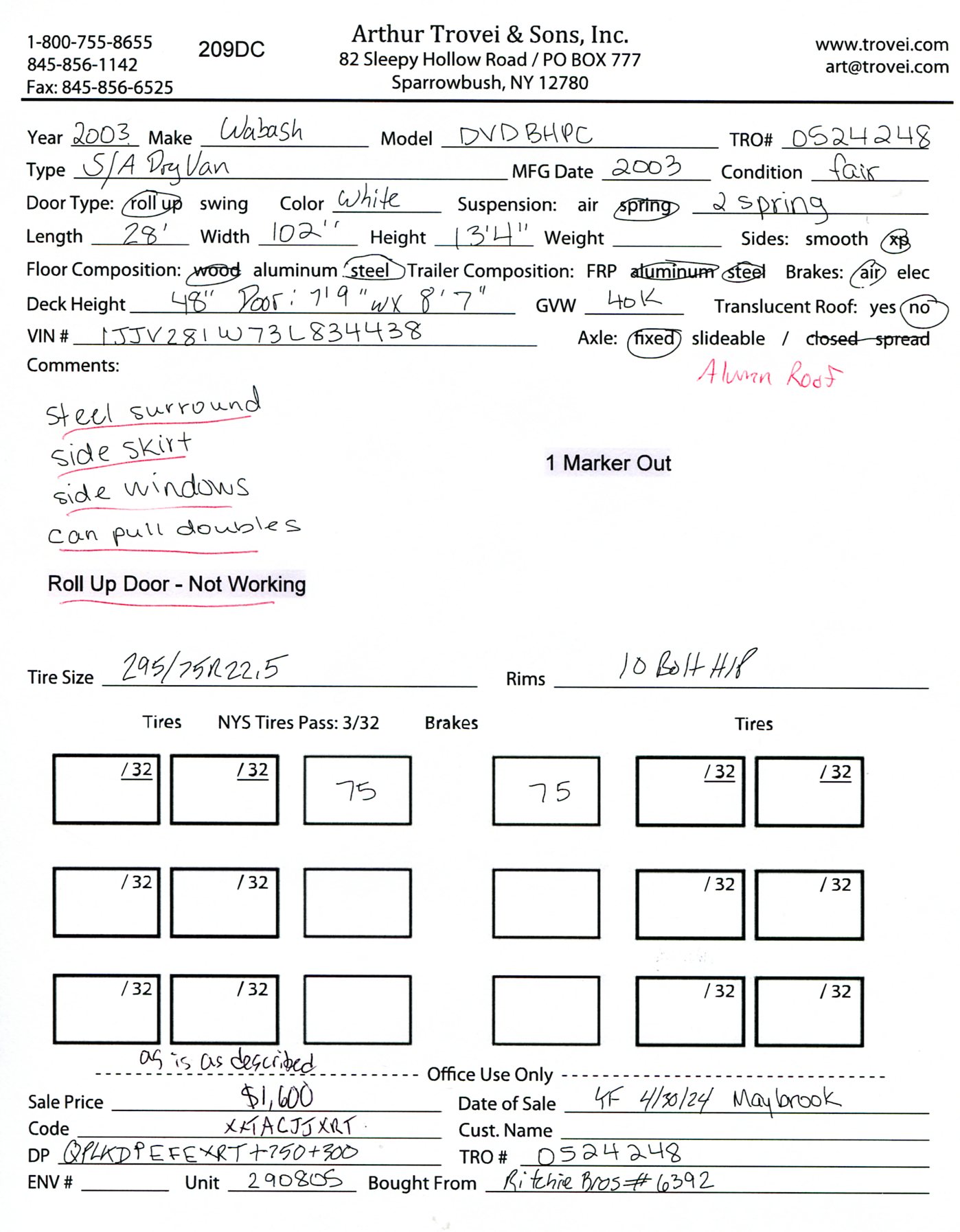 Inventory # 0524248Year: 2003 Make: Wabash Model: DVDBHPC Axles: Fixed Single Type: Dry Box Trailer VIN: 1JJV281W73L834438 Suspension: 2 Spring Tires: 295/75R22.5 Rims: 10 Bolt Hub Pilot - Steel Length: 28' Width: 102" Height: 13'4" Weight (Estimated): 8,920 lb GVW: 40,000 lb Floor Composition: Wood / Steel Trailer Composition: Aluminum / Steel Door Type: Roll Up - Steel Surround (Not Working) Door Opening Width: 7'9" Door Opening Height: 8'7" Added Details: Air Brakes, Can Pull Doubles, Side Skirts, Side Windows, Aluminum Roof, Vertical Logistics Price: $1,600 as is as described 209DCXXTACJJXXTQRTVDPEFEXRT+750+300 Terms of Sale