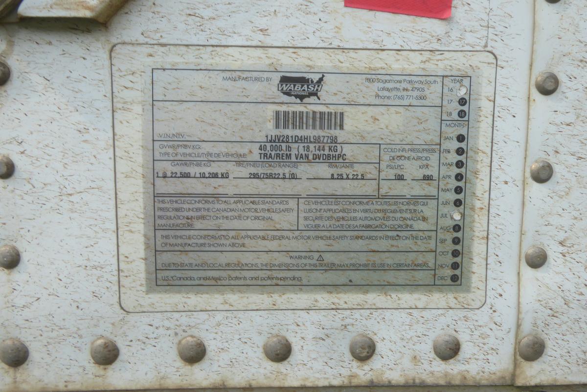 Inventory # 0530242Year: 2017 Make: Wabash Model: DVDBHPC Axles: Fixed single Type: Dry box trailer VIN: 1JJV281D4HL987798 Suspension: 2 Spring Tires: 295/75R22.5 Rims: 10 Bolt Hub Pilot - Steel Length: 28' Width: 102" Height: 13'4" Weight (Estimated): 8,760 lb GVW: 40,000 lb Floor Composition: Wood / Steel / Aluminum Trailer Composition: Steel / Aluminum Door Type: Roll Up - Galvanized Surround Door Opening Width: 7'9" Door Opening Height: 8'9" Added Details: Air Brakes, Side Windows, Can Pull Doubles, Aluminum Roof, Side Skirts, Vertical Logistics Price: $3,900 209DCXXTBIJJXXTQPLKDPGFEXRT+750+300 Terms of Sale