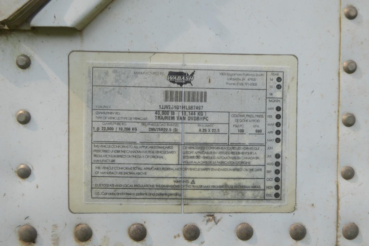 Inventory # 0530244Year: 2017 Make: Wabash Model: DVDBHPC Axles: Fixed single Type: Dry box trailer VIN: 1JJV281D1HL987497 Suspension: 2 Spring Tires: 295/75R22.5 Rims: 10 Bolt Hub Pilot - Steel Length: 28' Width: 102" Height: 13'4" Weight (Estimated): 8,760 lb GVW: 40,000 lb Floor Composition: Wood / Steel / Aluminum Trailer Composition: Steel / Aluminum Door Type: Roll Up - Galvanized Surround Door Opening Width: 7'9" Door Opening Height: 8'9" Added Details: Air Brakes, Side Windows, Can Pull Doubles, Aluminum Roof, Side Skirts, Vertical Logistics Price: $3,900 209DCXXTBIJJXXTQPLKDPGAEXRT+750+300 Terms of Sale