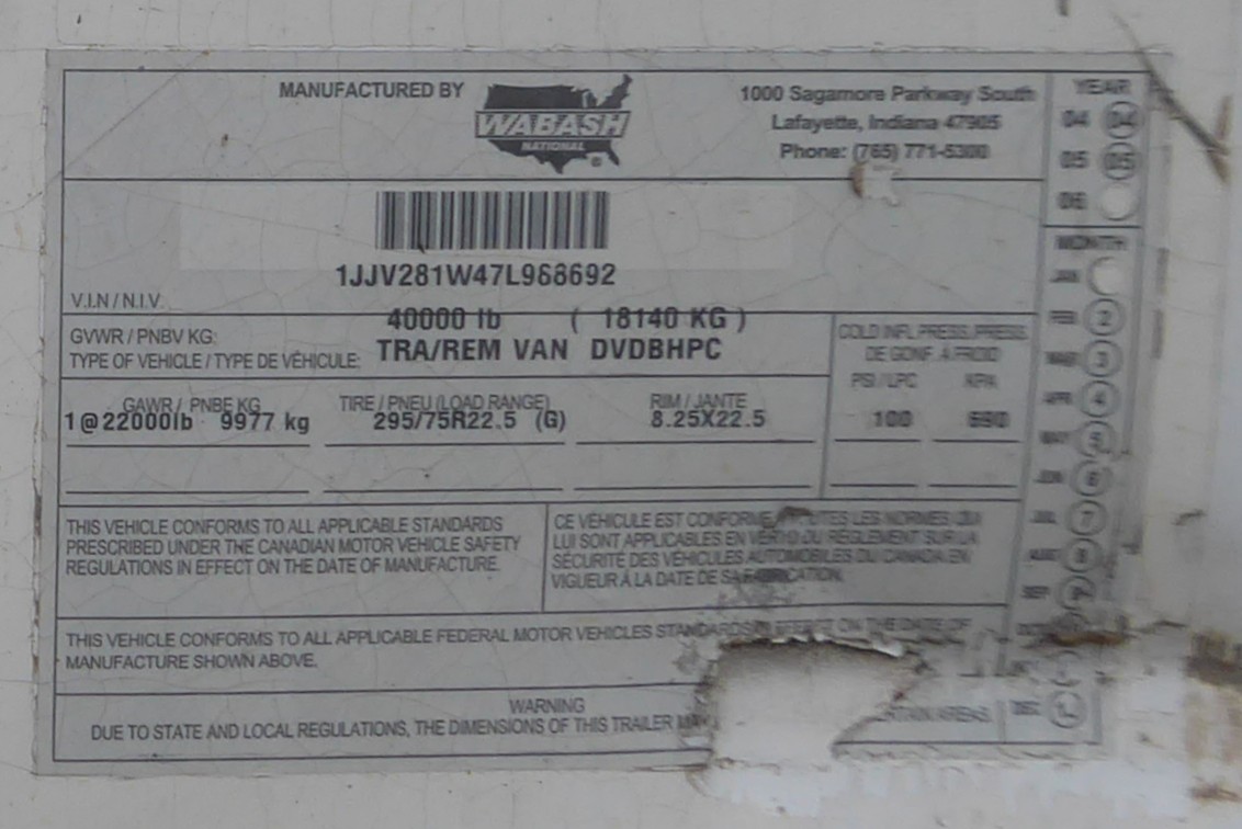 Inventory # 0530246Year: 2007 Make: Wabash Model: DVHDHPC Axles: Fixed single Type: Dry box trailer VIN: 1JJV281W47L988692 Suspension: 2 Spring Tires: 295/75R22.5 Rims: 10 Bolt Hub Pilot - Steel Length: 28' Width: 102" Height: 13'4" Weight (Estimated): 8,760 lb GVW: 40,000 lb Floor Composition: Wood / Steel / Aluminum Trailer Composition: Steel Door Type: Roll Up - Steel Surround Door Opening Width: 7'8" Door Opening Height: 8'10" Added Details: Air Brakes, Can Pull Doubles, Aluminum Roof, Side Windows, Side Skirts, Vertical Logistics, Some Aluminum Crossmembers Price: $1,900 209DCXXTAEJJXXTQRTVDPBCJXRT+750+300 Terms of Sale