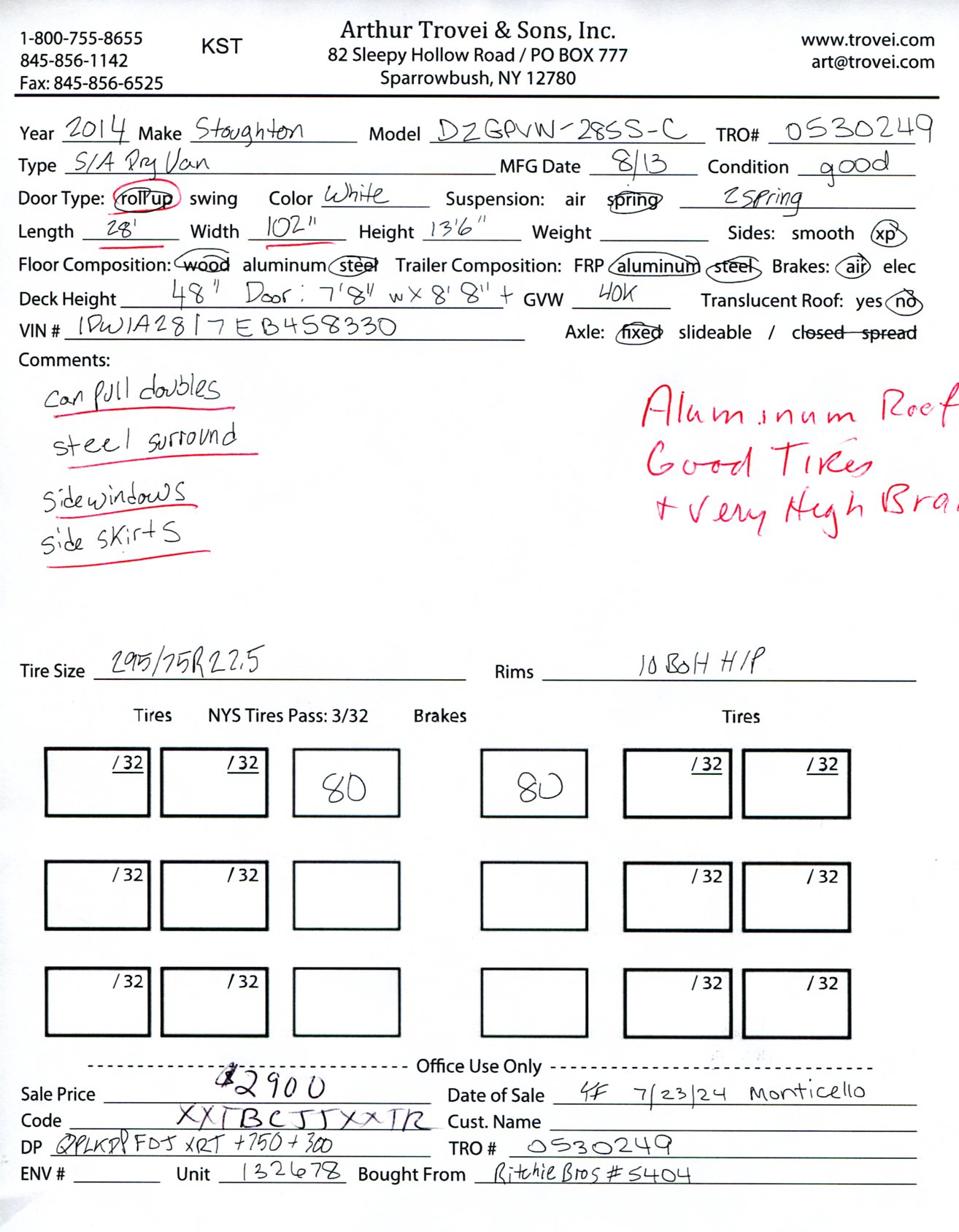 Inventory # 0530249Year: 2014 Make: Stoughton Model: DZGPVW-285S-C Axles: Fixed Single Type: Dry Box Trailer VIN: 1DW1A2817EB458330 Suspension: 2 Spring Tires: 295/75R22.5 Rims: 10 Bolt Hub Pilot - Steel Length: 28' Width: 102" Height: 13'6" Weight (Approximate): 8,540 lb GVW: 40,000 lb Floor Composition: Wood / Steel Trailer Composition: Steel / Aluminum Door Type: Roll Up - Steel Surround Door Opening Width: 7'8" Door Opening Height: 8'8" Added Details: Air Brakes, Can Pull Doubles, Aluminum Roof, Side Windows, Side Skirts Price: $2,900 KSTXXTBCJJXXTRQPLKDPFDJXRT+750+300 Terms of Sale