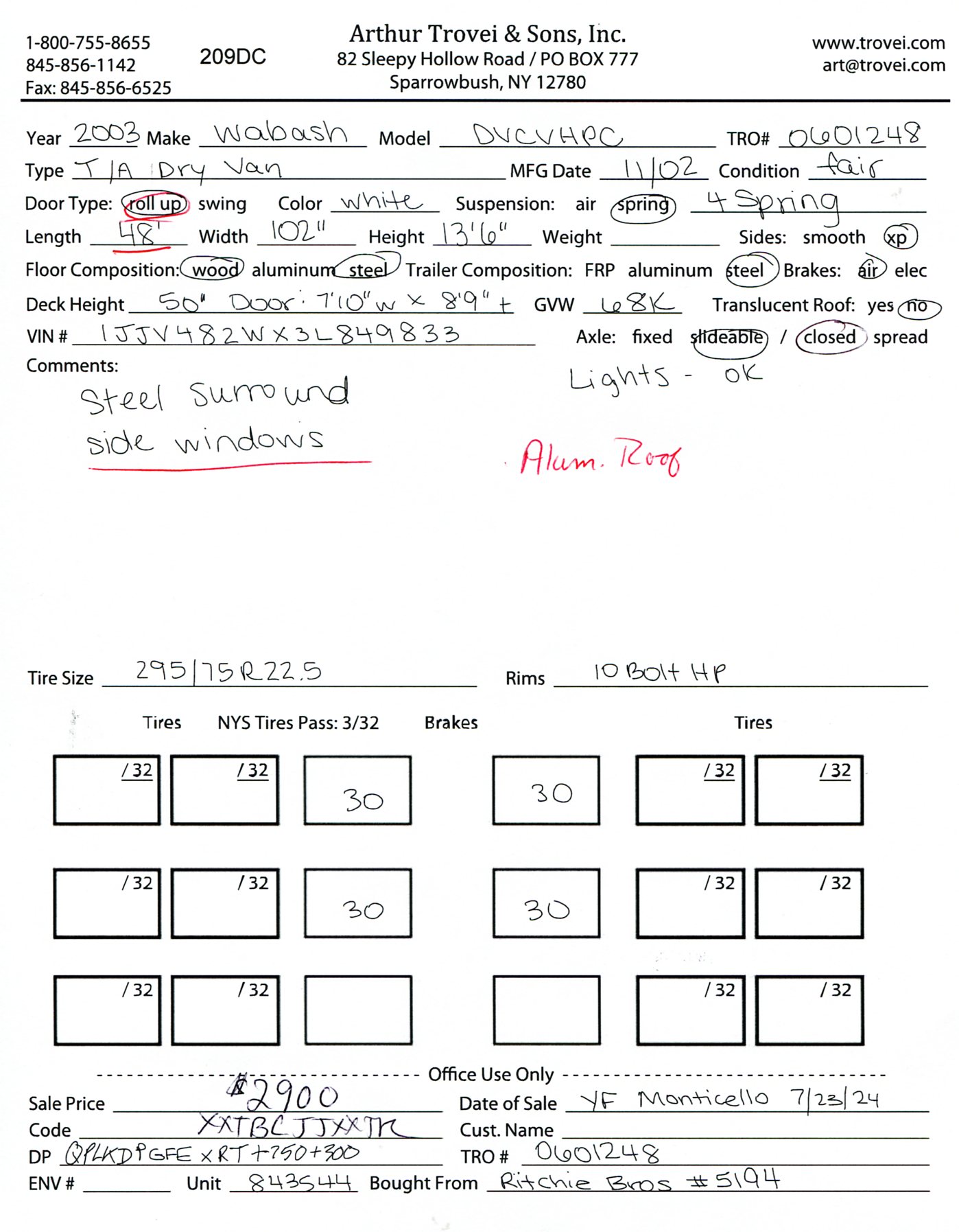 Inventory # 0601248Year: 2003 Make: Wabash Model: DVCVHPC Axles: Slideable Closed Tandem Type: Dry Box Trailer VIN: 1JJV482WX3L849833 Suspension: 4 Spring Tires: 295/75R22.5 Rims: 10 Bolt Hub Pilot - Steel Length: 48' Width: 102" Height: 13'6" Load Width: 7'10" Load Height: 8'9" Weight (Estimated): 13,980 lb GVWR: 68,000 lb Trailer Composition: Steel Floor Composition: Wood / Steel Door Type: Roll Up Door - Steel Surround Added Details: Air Brakes, Aluminum Roof Price: $2,900 209DCXXTBCJJXXTRQPLKDPGFEXRT+750+300 Terms of Sale
