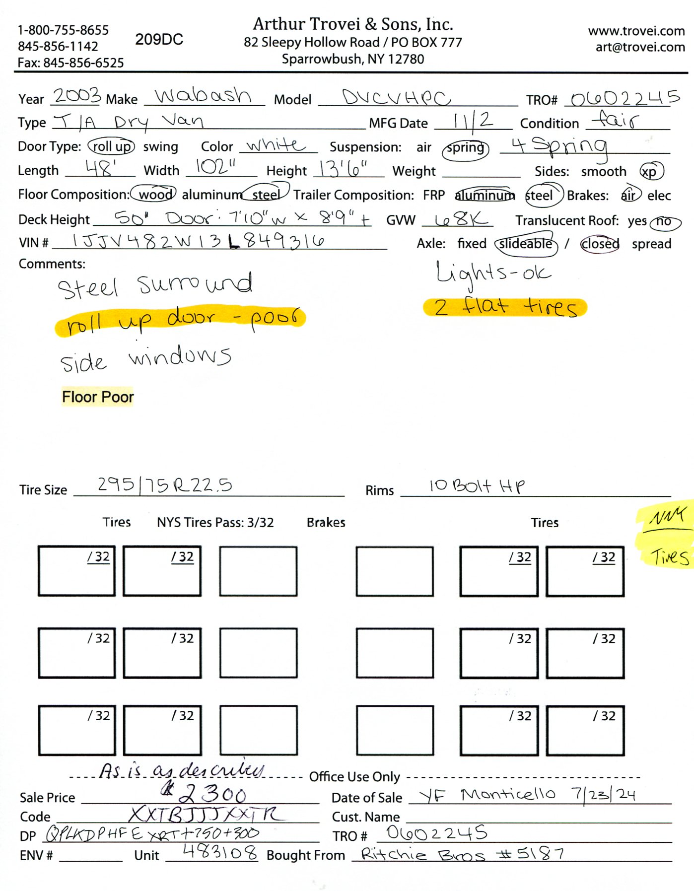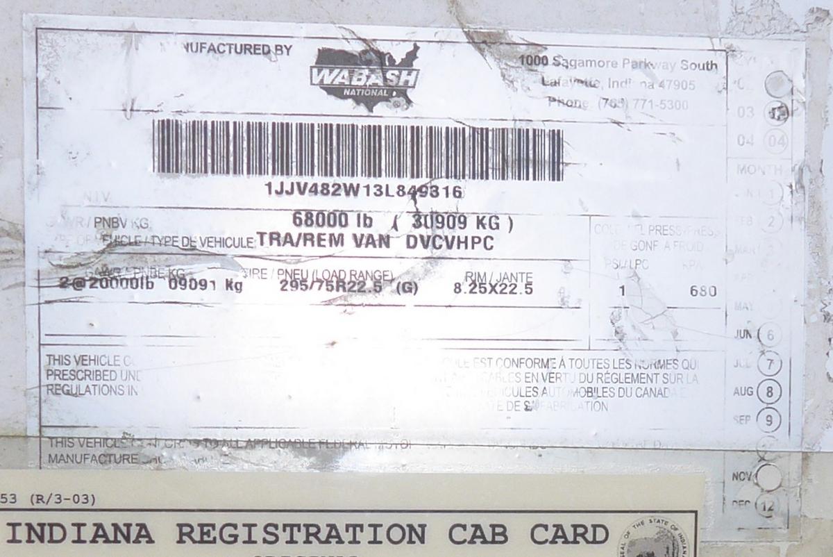 Inventory # 0602245Year: 2003 Make: Wabash Model: DVCVHPC Axles: Slideable Closed Tandem Type: Dry Box Trailer VIN: 1JJV482W13L849316 Suspension: 4 Spring Tires: 295/75R22.5 Rims: 10 Bolt Hub Pilot - Steel Length: 48' Width: 102" Height: 13'6" Load Width: 7'10" Load Height: 8'9" Weight (Estimated): 13,980 lb GVWR: 68,000 lb Trailer Composition: Aluminum / Steel Floor Composition: Wood / Steel (Poor) Door Type: Roll Up Door - Steel Surround (Poor) Added Details: Air Brakes, Aluminum Roof, Side Windows Price: $2,300 as is as described NNY 209DCXXTBJJJXXTRQPLKDPHFEXRT+750+300 Terms of Sale