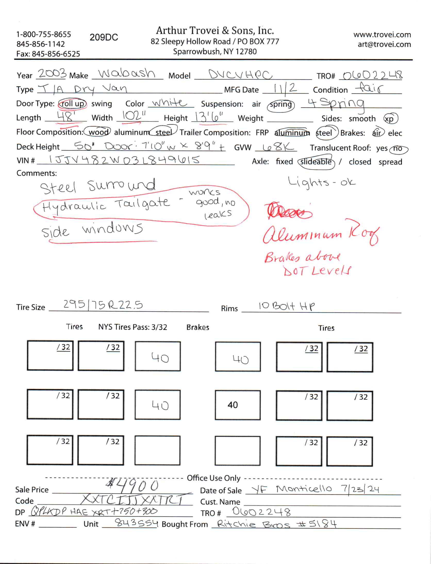 Inventory # 0602248Year: 2003 Make: Wabash Model: DVCVHPC Axles: Slideable Closed Tandem Type: Dry Box Trailer VIN: 1JJV482W03L849615 Suspension: 4 Spring Tires: 295/75R22.5 Rims: 10 Bolt Hub Pilot - All Steel Length: 48' Width: 102" Height: 13'6" Load Width: 7'10" Load Height: 8'9" Weight (Estimated): 13,980 lb GVWR: 68,000 lb Trailer Composition: Aluminum / Steel Floor Composition: Wood / Steel Door Type: Roll Up Door - Steel Surround Lift Gate: Maxon 3,000 lb Capacity, Works Well - No Leaks Added Details: Air brakes, Aluminum Roof, Side Windows Price: $4,900 209DCXXTCIJJXXTRTQPLKDPHAEXRT+750+300 Terms of Sale