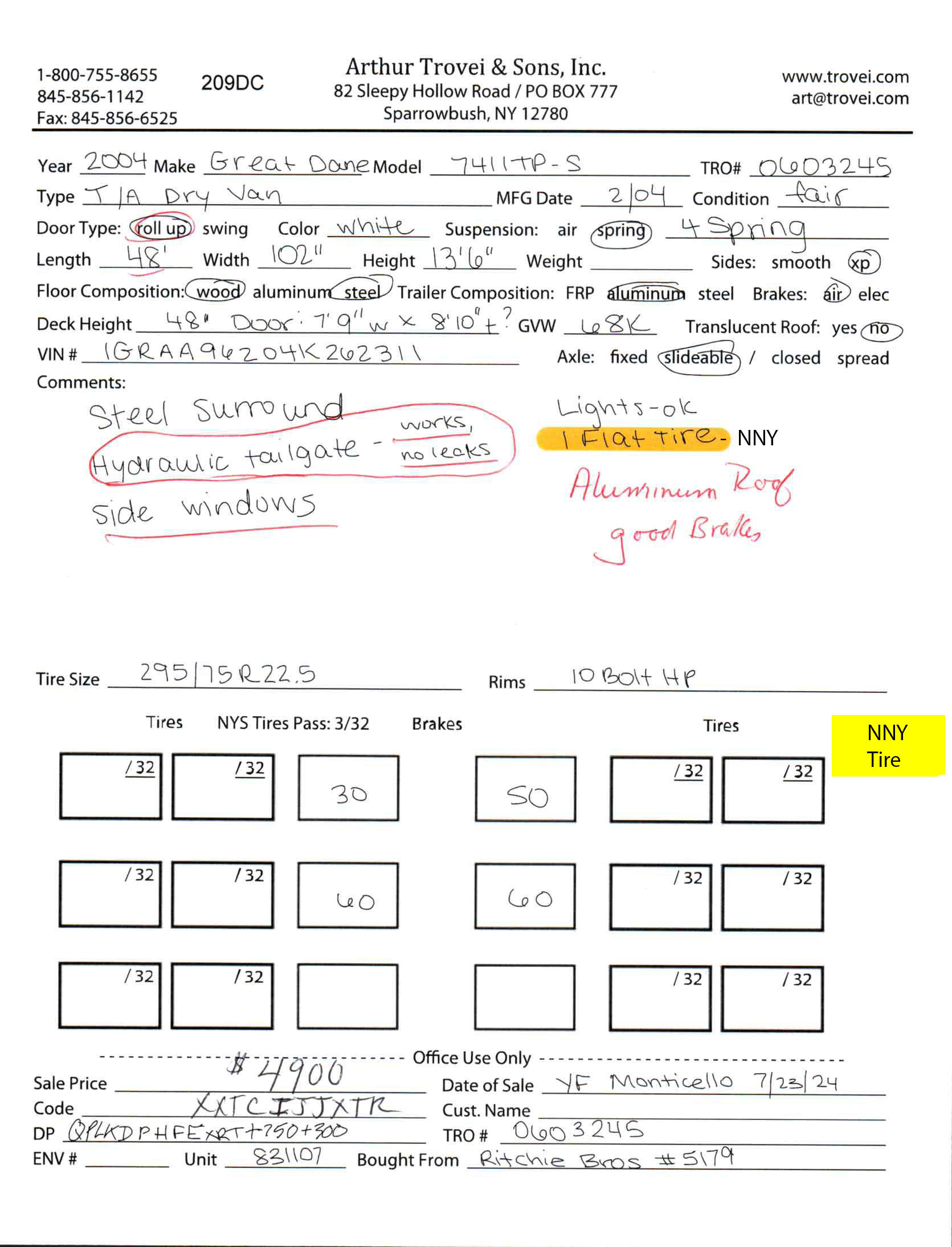 Inventory # 0603245Year: 2004 Make: Great Dane Model: 7411TP-S Axles: Slideable Closed Tandem Type: Dry Box Trailer VIN: 1GRAA96204K262311 Suspension: 4 Spring Tires: 275/80R22.5 / 295/75R22.5 Rims: 10 Bolt Hub Pilot - Steel Length: 48' Width: 102" Height: 13'6" Load Width: 7'9" Load Height: 8'10" Weight (Estimated): 14,580 lb GVWR: 68,000 lbs Trailer Composition: Aluminum Floor Composition: Wood / Steel Door Type: Roll Up Door - Steel Surround Lift Gate Details: Maxon - Works Well, No Leaks Added Details: Aluminum Roof, Side Windows Price: $4,900 NNY 209DCXXTCIJJXTRQPLKDPHFEXRT+750+300 Terms of Sale