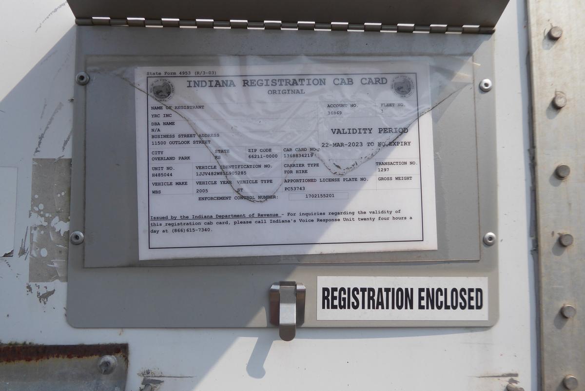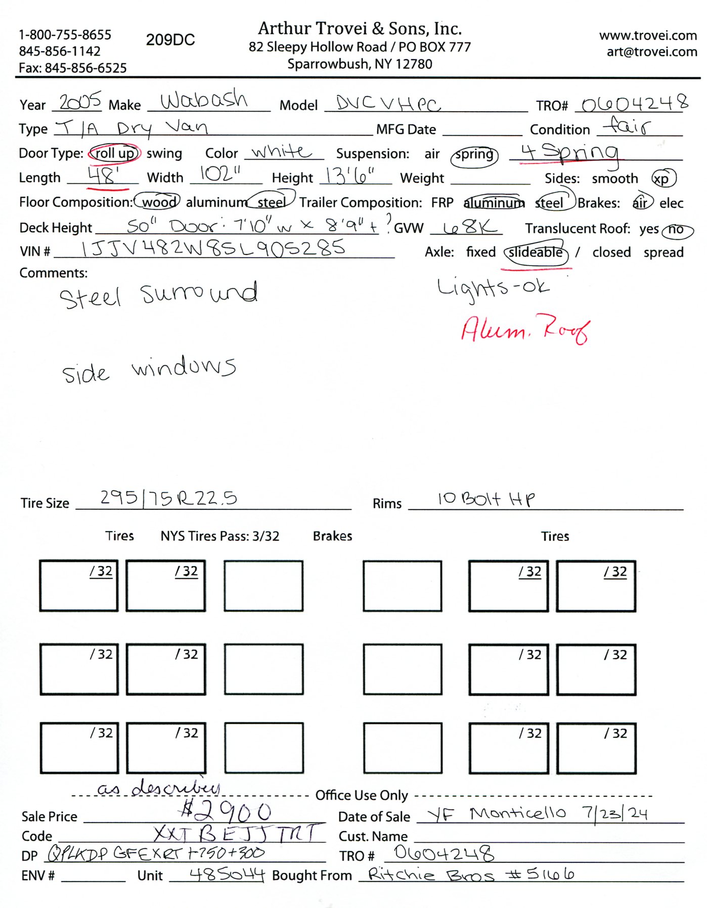 Inventory # 0604248Year: 2005 Make: Wabash Model: DVCVHPC Axles: Slideable Closed Tandem Type: Dry Box Trailer VIN: 1JJV482W85L905285 Suspension: 4 Spring Tires: 295/75R22.5 Rims: 10 Bolt Hub Pilot - Steel Length: 48' Width: 102" Height: 13'6" Load Width: 7'10" Load Height: 8'9" Weight (Estimated): 13,980 lb GVWR: 68,000 lb Trailer Composition: Aluminum / Steel Floor Composition: Wood / Steel Door Type: Roll Up Door - Steel Surround Added Details: Air Brakes, Aluminum Roof, Side Windows Price: $2,900 as described 209DCXXTBEJJXXTQPLKDPGFEXRT+750+300 Terms of Sale