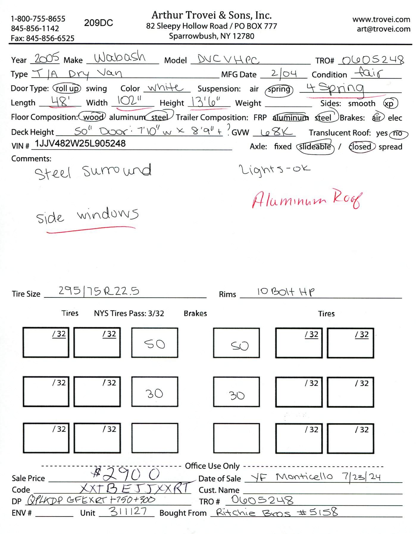 Inventory # 0605248Year: 2005 Make: Wabash Model: DVCVHPC Axles: Slideable Closed Tandem Type: Dry Box Trailer VIN: 1JJV482W25L905248 Suspension: 4 Spring Tires: 295/75R22.5 Rims: 10 Bolt Hub Pilot - Steel Length: 48' Width: 102" Height: 13'6" Load Width: 7'10" Load Height: 8'9" Weight (Estimated): 13,980 lb GVWR: 68,000 lb Trailer Composition: Aluminum / Steel Floor Composition: Wood / Steel Door Type: Roll Up Door - Steel Surround Added Details: Air Brakes, Aluminum Roof, Side Windows Price: $2,900 209DCXXTBEJJXXTQPLKDPGFEXRT+750+300 Terms of Sale