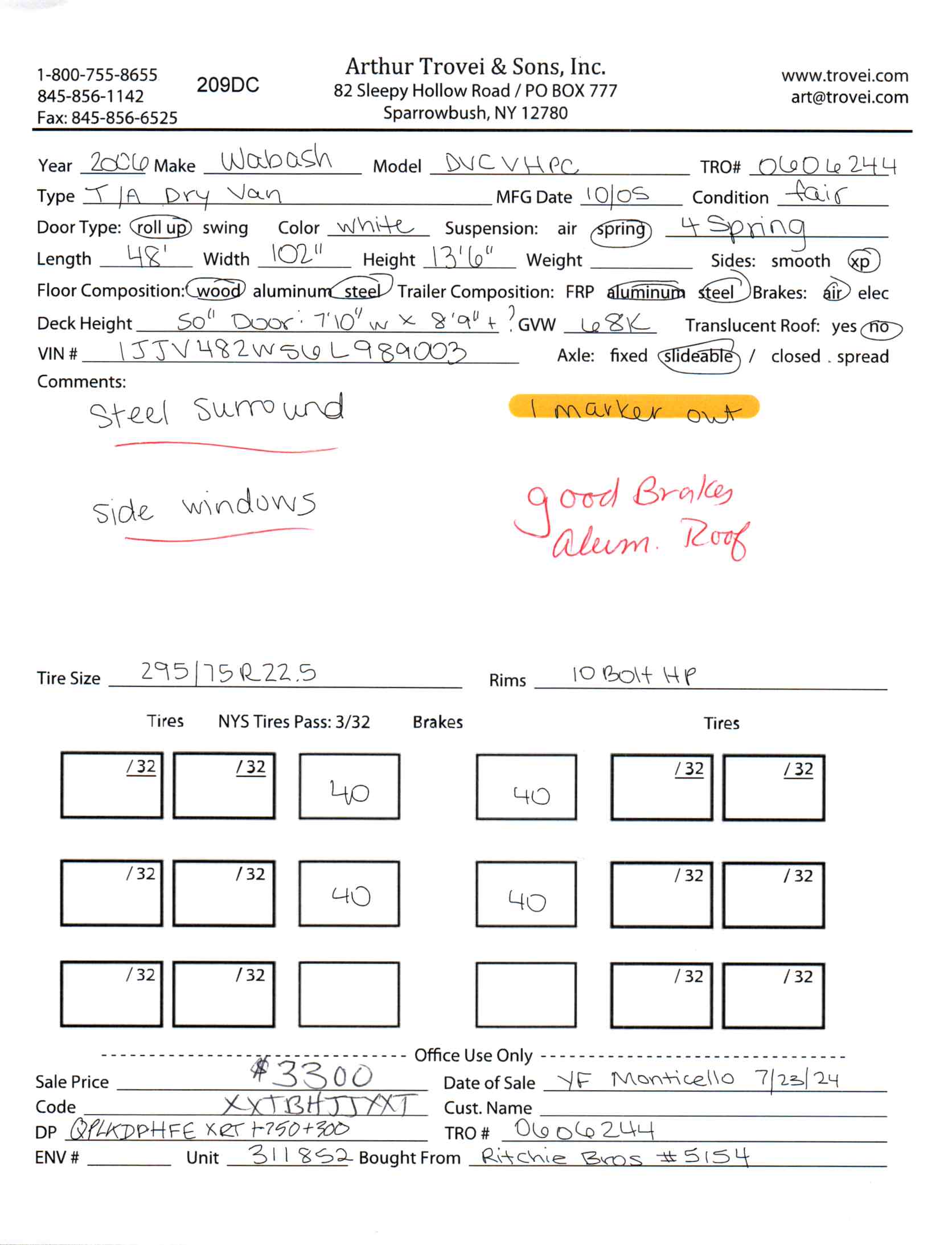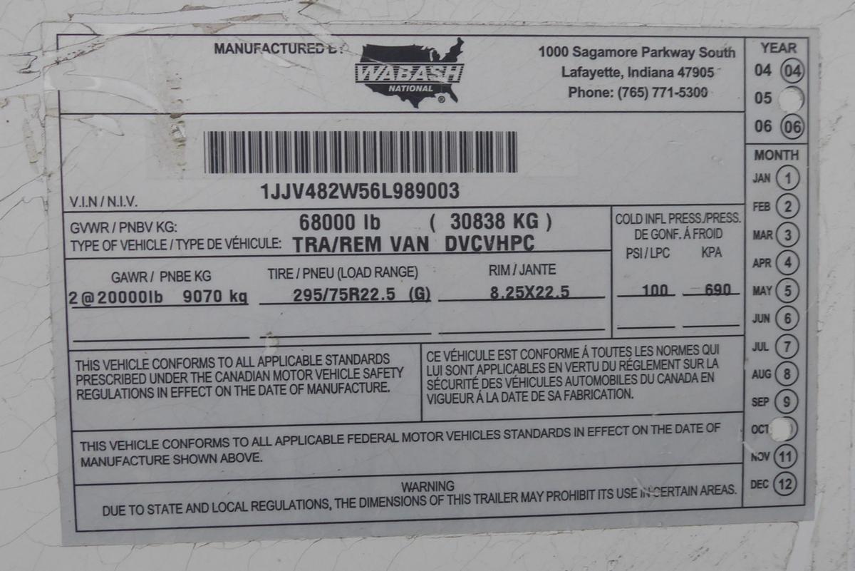 Inventory # 0606244Year: 2006 Make: Wabash Model: DVCVHPC Axles: Slideable Closed Tandem Type: Dry Box Trailer VIN: 1JJV482W56L989003 Suspension: 4 Spring Tires: 295/75R22.5 Rims: 10 Bolt Hub Pilot - Steel Length: 48' Width: 102" Height: 13'6" Load Width: 7'10" Load Height: 8'9" Weight (Estimated): 13,980 lb GVWR: 68,000 lb Trailer Composition: Aluminum / Steel Floor Composition: Wood / Steel Door Type: Roll Up Door - Steel Surround Added Details: Air Brakes, Aluminum Roof, Side Windows Price: $3,300 209DCXXTBHJJXXTQPLKDPHFEXRT+750+300 Terms of Sale