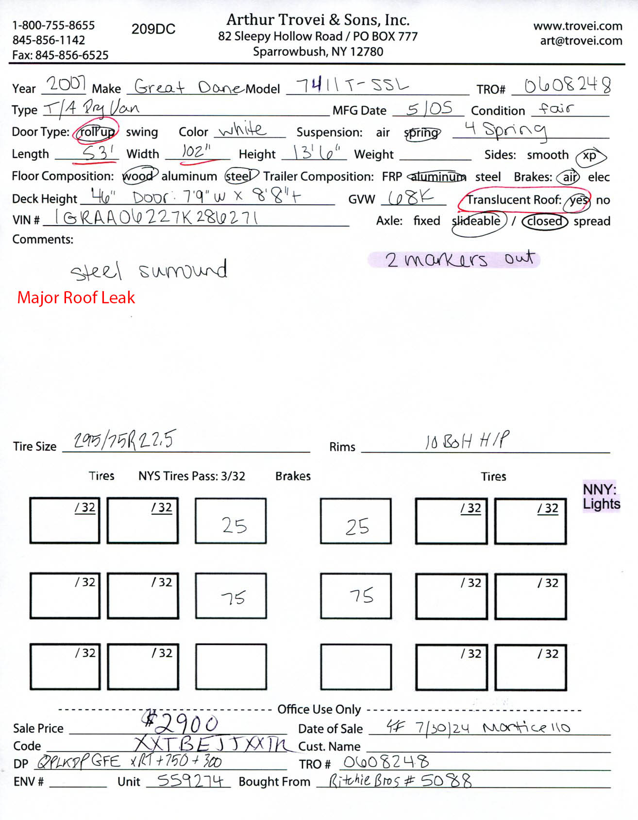 Inventory # 0608248Year: 2007 Make: Great Dane Model: 7411T-SSL Axles: slideable closed tandem Type: Dry Box Trailer VIN: 1GRAA06227K286271 Suspension: 4 Spring Tires: 295/75R22.5 Rims: 10 Bolt Hub Pilot - Steel Length: 53' Width: 102" Height: 13'6" Load Width: 7'9" Load Height: 8'8" Weight (Estimated): 15,260 lb GVWR: 68,000 lb Trailer Composition: Aluminum Floor Composition: Wood / Steel Door Type: Roll Up Door - Steel Surround Added Details: Translucent Roof (Major Leak) Price: $2,900 NNY 209DCXXTBEJJXXTRQRTVDPGFEXRT+750+300 Terms of Sale