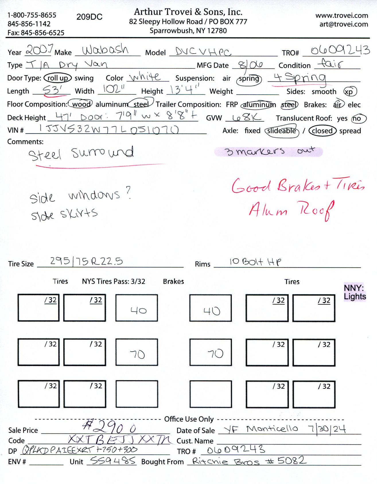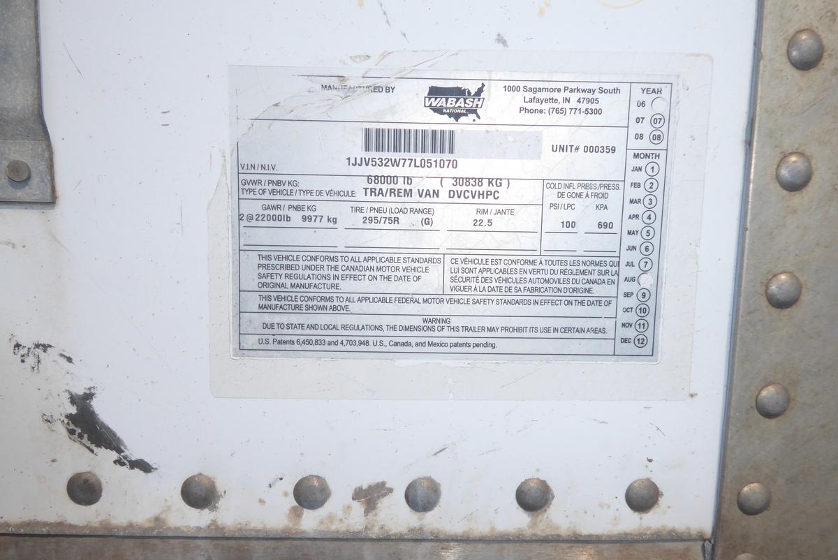 Inventory # 0609243Year: 2007 Make: Wabash Model: DVCVHPC Axles: Slideable Closed Tandem Type: Dry Box Trailer VIN: 1JJV532W77L051070 Suspension: 4 Spring Tires: 295/75R22.5 Rims: 10 Bolt Hub Pilot - Steel Length: 53' Width: 102" Height: 13'4" Load Width: 7'9" Load Height: 8'8" Weight (Estimated): 15,460 lb GVWR: 68,000 lb Trailer Composition: Aluminum / Steel Floor Composition: Wood / Steel Door Type: Roll Up Door - Steel Surround Added Details: Aluminum Roof, Side Skirts Price: $2,900 NNY 209DCXXTBEJJXXTRQRTVDPAIEEXRT+750+300 Terms of Sale