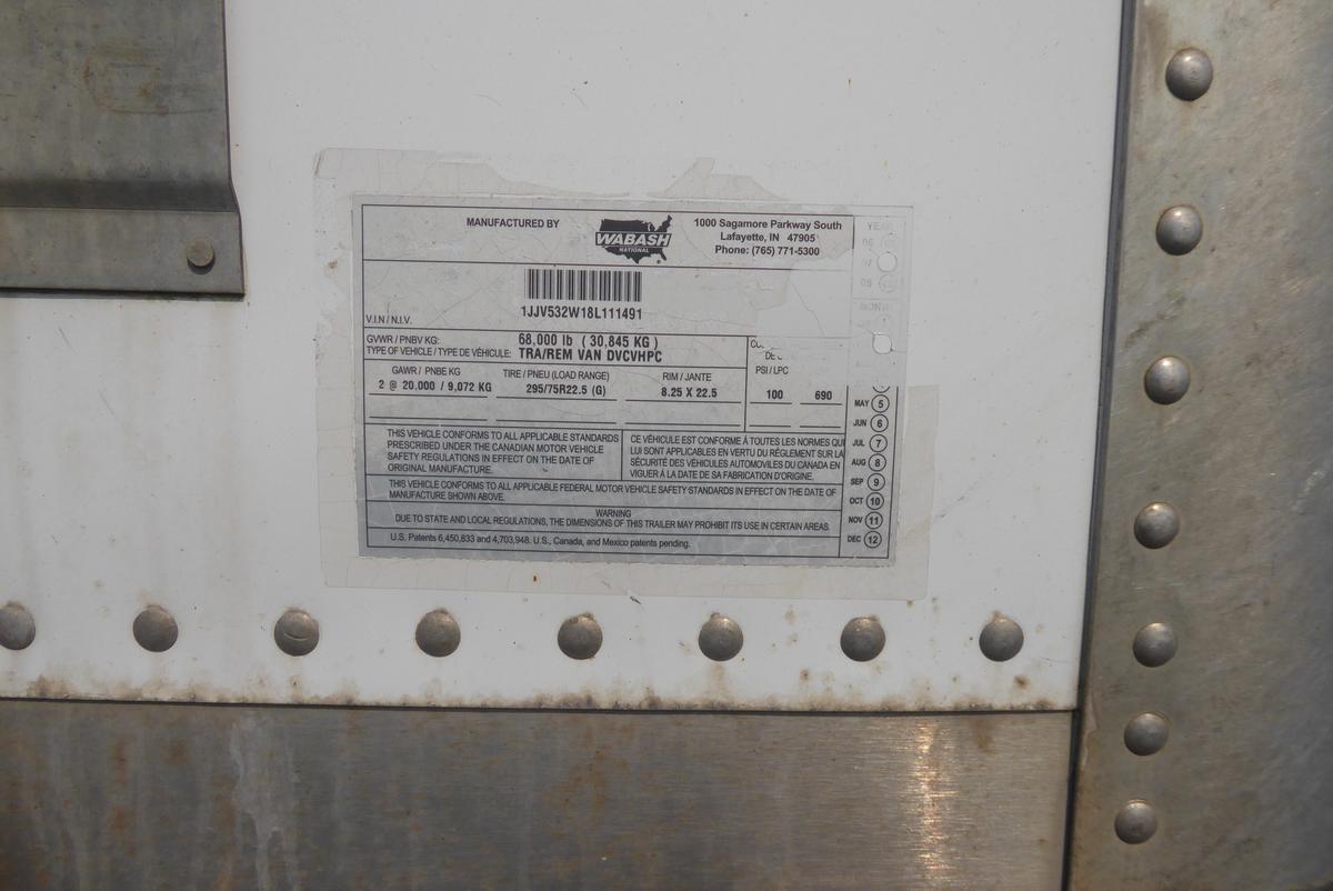 Inventory # 0609246Year: 2008 Make: Wabash Model: DVCVHPC Axles: Slideable Closed Tandem Type: Dry Box Trailer VIN: 1JJV532W18L111491 Suspension: 4 Spring Tires: 295/75R22.5 Rims: 10 Bolt Hub Pilot - Steel Length: 53' Width: 102" Height: 13'4" Load Width: 8'2" Load Height: 8'10" Weight (Estimated): 14,760 lb GVWR: 68,000 lb Trailer Composition: Aluminum / Steel Floor Composition: Wood / Steel Door Type: Roll Up Door - Steel Surround Added Details: Vertical Logistics, Alumium Roof, Side Windows, Side Skirts Price: $3,250 209DCXTRBHIJXXTQPLKDPAIEEXRT+750+300 Terms of Sale