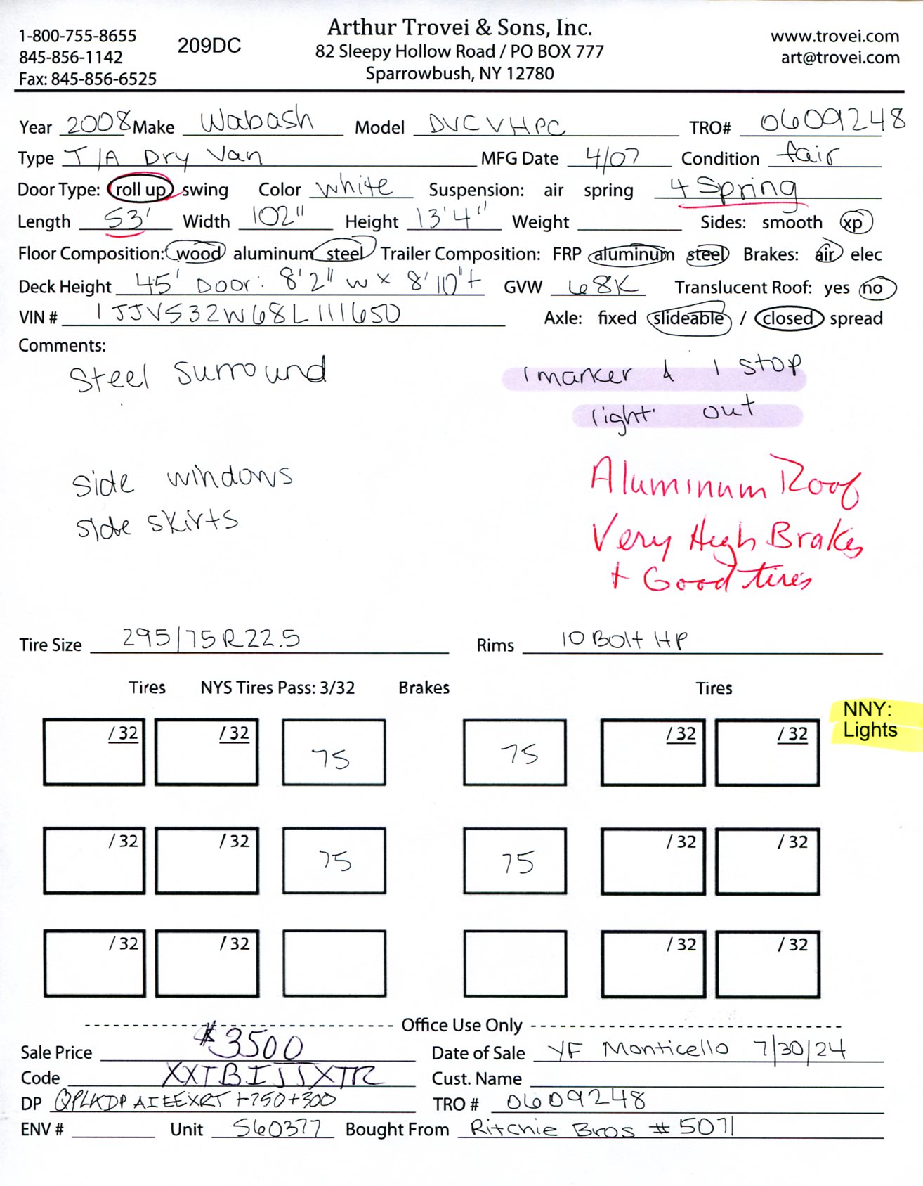 Inventory # 0609248Year: 2008 Make: Wabash Model: DVCVHPC Axles: Slideable Closed Tandem Type: Dry Box Trailer VIN: 1JJV532W68L111650 Suspension: 4 Spring Tires: 295/75R22.5 Rims: 10 Bolt Hub Pilot - Steel Length: 53' Width: 102" Height: 13'4" Load Width: 8'2" Load Height: 8'10" Weight (Estimated): 14,760 lb GVWR: 68,000 lb Trailer Composition: Aluminum / Steel Floor Composition: Wood / Steel Door Type: Roll Up Door - Steel Surround Added Details: Vertical Logistics, Aluminum Roof, Side Windows, Side Skirts Price: $3,500 NNY 209DCXTRBIJJXXTQPLKDPAIEEXRT+750+300 Terms of Sale