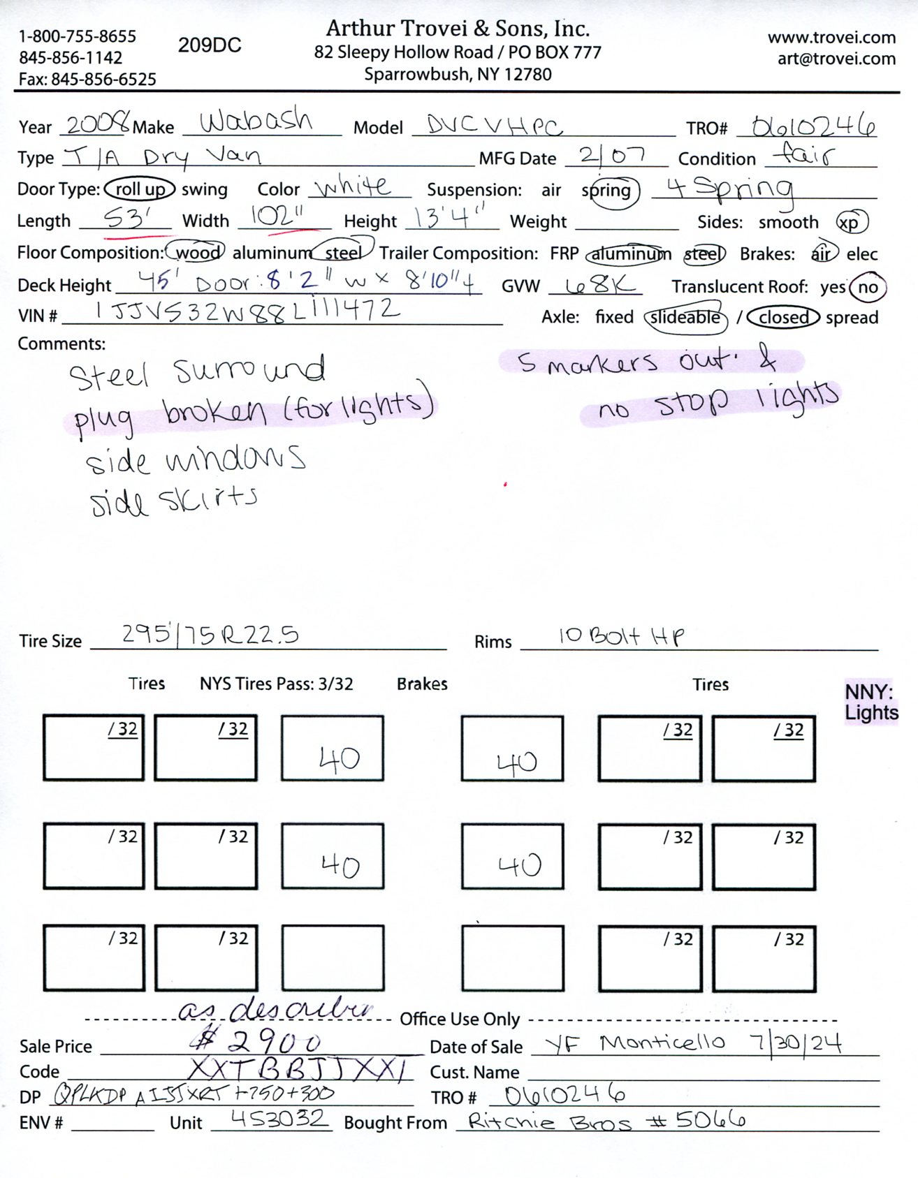 Inventory # 0610246Year: 2008 Make: Wabash Model: DVCVHPC Axles: Slideable Closed Tandem Type: Dry Box Trailer VIN: 1JJV532W88L111472 Suspension: 4 Spring Tires: 295/75R22.5 Rims: 10 Bolt Hub Pilot - Steel Length: 53' Width: 102" Height: 13'4" Load Width: 8'2" Load Height: 8'10" Weight (Estimated): 14,760 lb GVWR: 68,000 lb Trailer Composition: Aluminum / Steel Floor Composition: Wood / Steel Door Type: Roll Up Door - Steel Surround Added Details: Vertical Logistics, Aluminum Roof, Side Windows, Side Skirts, Plug Broken For Lights Price: $2,900 as is as described NNY 209DCXTRBBJJXXTQPLKDPAIJJXRT+750+300 Terms of Sale