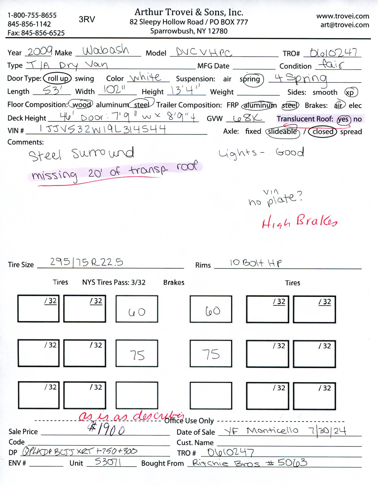 Inventory # 0610247Year: 2009 Make: Wabash Model: DVCVHPC Axles: Slideable Closed Tandem Type: Dry Box Trailer VIN: 1JJV532W19L314544 Suspension: 4 Spring Tires: 295/75R22.5 Rims: 10 Bolt Hub Pilot - Steel Length: 53' Width: 102" Height: 13'4" Load Width: 7'9" Load Height: 8'9" Weight (Estimated): 14,760 lb GVWR: 68,000 lb Trailer Composition: Aluminum / Steel Floor Composition: Wood / Steel Door Type: Roll Up Door - Steel Surround Added Details: Vertical Logistics, Translucent Roof (20' Missing) Price: $1,900 as is as described 3RVQPLKDPBCJJXRT+750+300 Terms of Sale