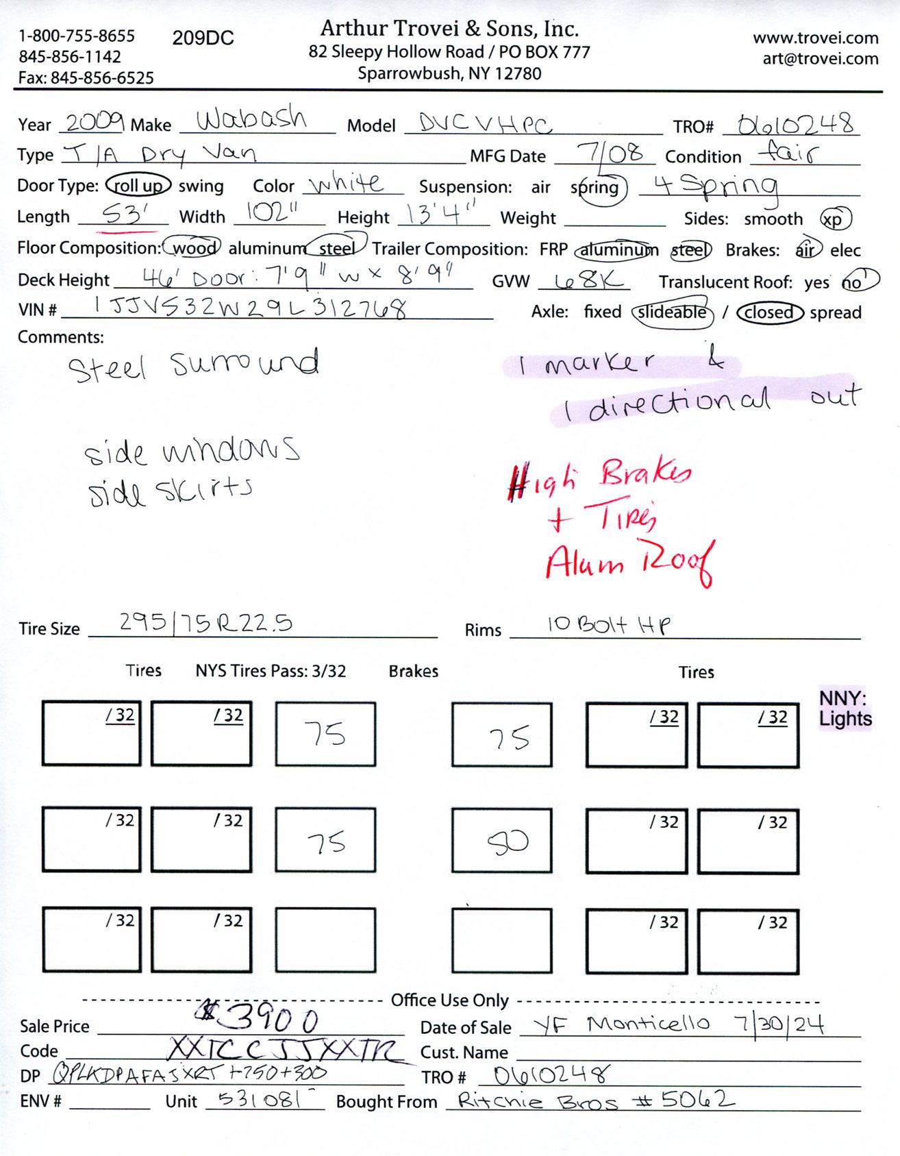 Inventory # 0610248Year: 2009 Make: Wabash Model: DVCVHPC Axles: Slideable Closed Tandem Type: Dry Box Trailer VIN: 1JJV532W29L312768 Suspension: 4 Spring Tires: 295/75R22.5 Rims: 10 Bolt Hub Pilot - Steel Length: 53' Width: 102" Height: 13'4" Load Width: 7'9" Load Height: 8'9" Weight (Estimated): 14,760 lb GVWR: 68,000 lb Trailer Composition: Aluminum / Steel Floor Composition: Wood / Steel Door Type: Roll Up Door - Steel Surround Added Details: Vertical Logistics, Aluminum Roof, Side Windows, Side Skirts Price: $3,900 NNY 209DCXXTCCJJXXTRQPLKDPAFAJXRT+750+300 Terms of Sale