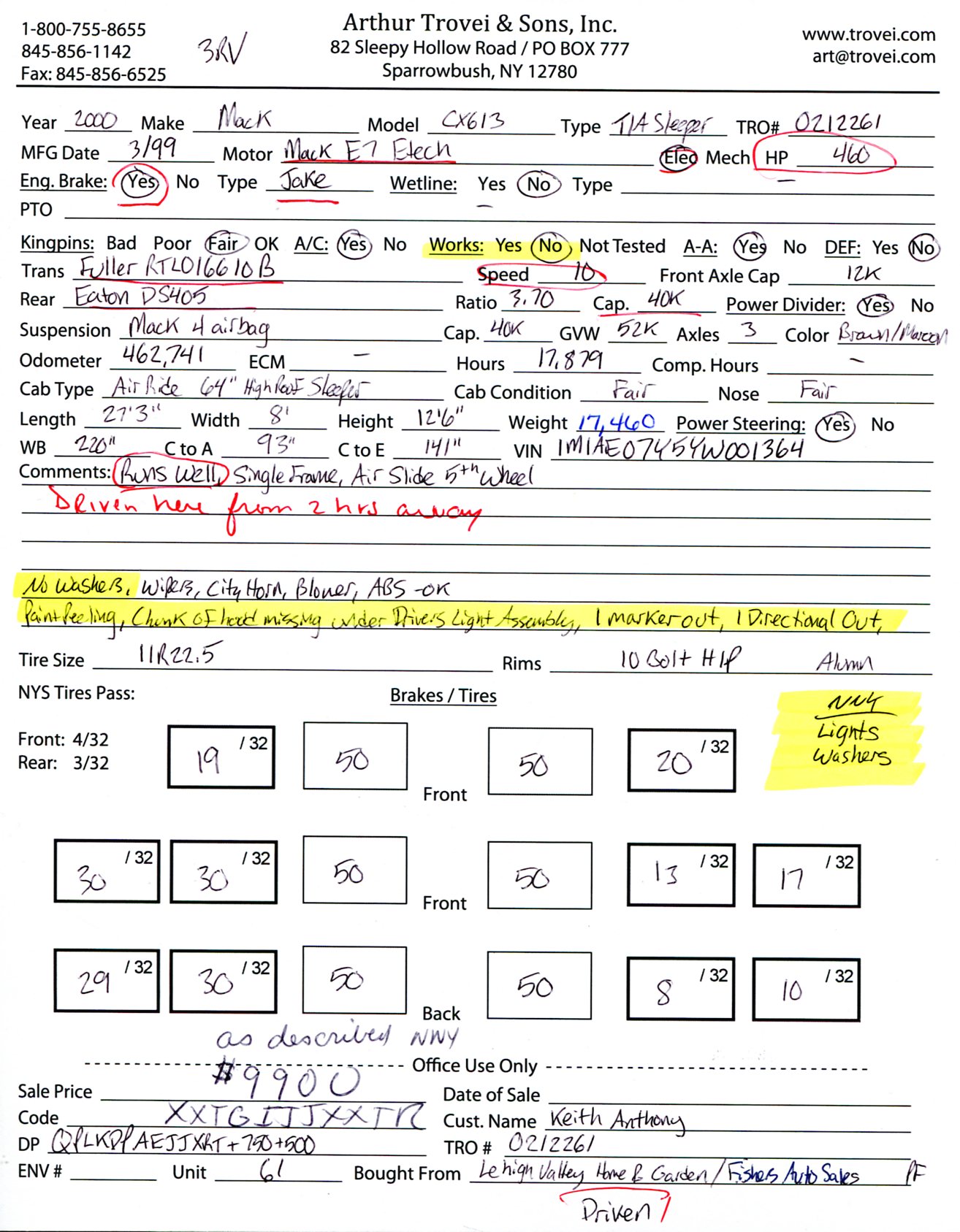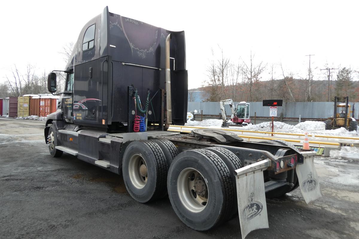 Inventory # 0212261Year: 2000 Make: Mack Model: CX613 Type: Tandem Axle Sleeper Cab Tractor VIN: 1M1AE07Y5YW001364 Motor: Mack E7 Etech Elec 460 HP Air to Air: Yes Air Conditioning: Yes (Not Working) Engine Brake: Jake DEF: No Transmission: Fuller RTLO16610B 10 Speed PTO: No Wetline: No Front Axle: 12,000 lb Rear: Eaton DS405 40,000 lb Ratio: 3.70 Power Divider: Yes Suspension: Mack 4 Air Bag 40,000 lb Tires: 11R24.5 Rims: 10 Bolt Hub Pilot - Aluminum Odometer Reading: 462,741 ECM: Hour Meter Reading: 17,879 Computer Hour Reading: Length: 27'3" Width: 8' Height: 12'6" Wheelbase: 220" Cab to Axle: 93" Cab to End: 141" Weight: 17,460 lb GVW: 52,000 lb Sleeper Details: Air Ride 64" High Roof Added Details: Runs Well, Single Frame, Air Slide 5th Wheel Price: $9,900 as described NNY 3RVXXTGIJJXXTRQPLKDPAEJJXRT+750+500 Terms of Sale