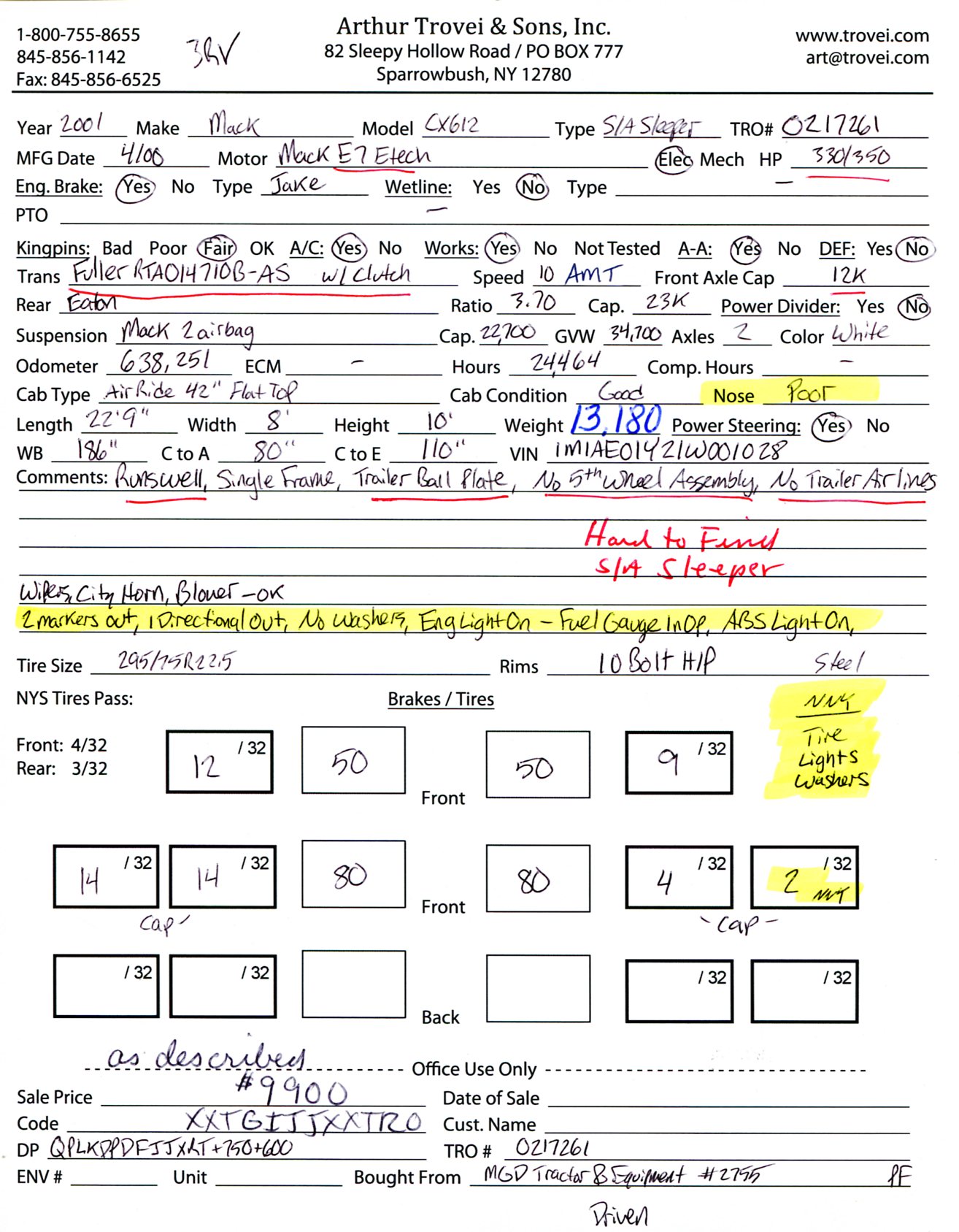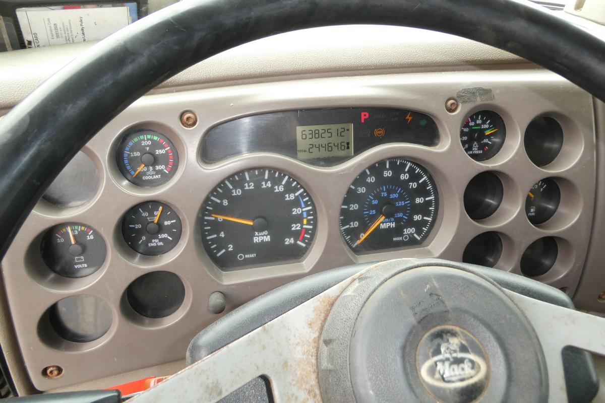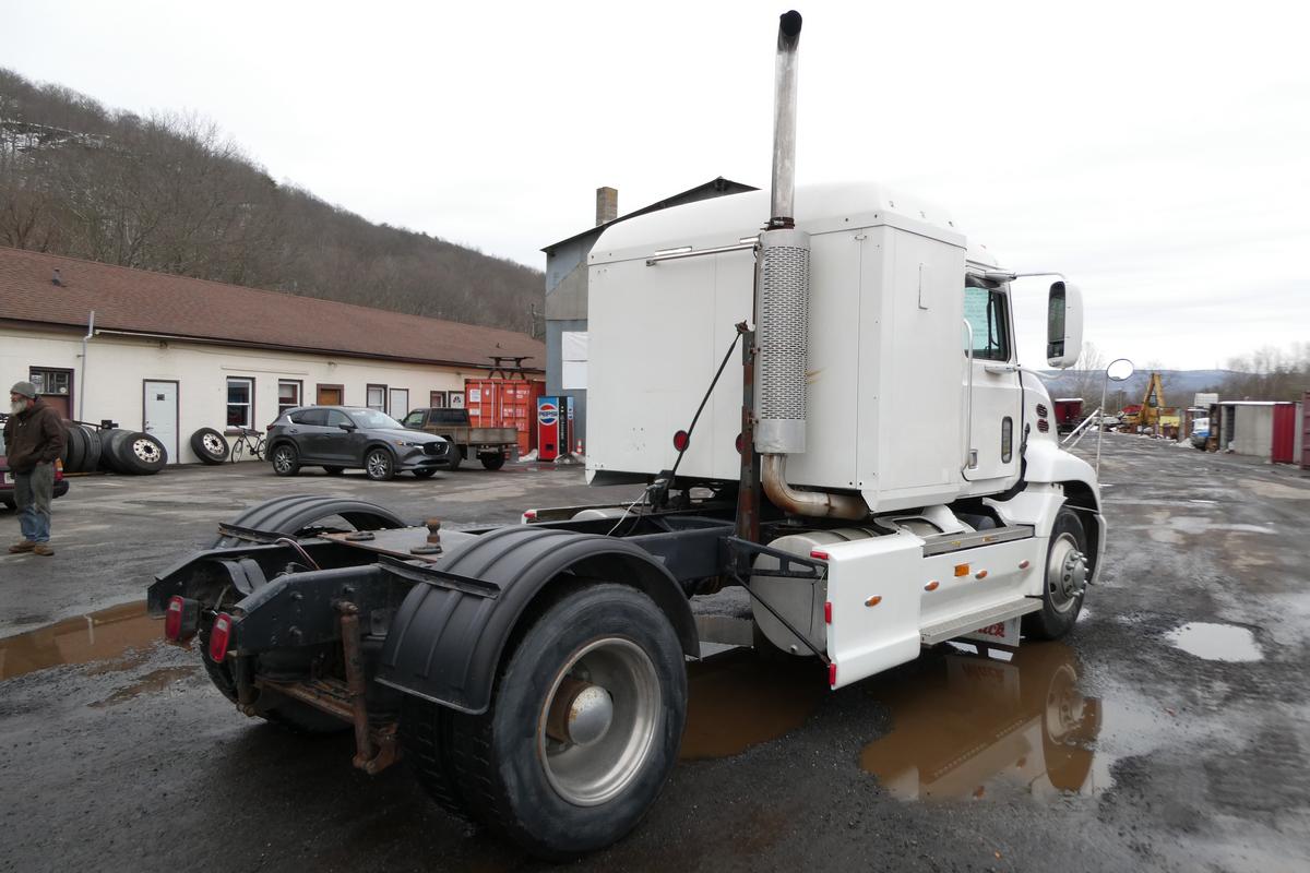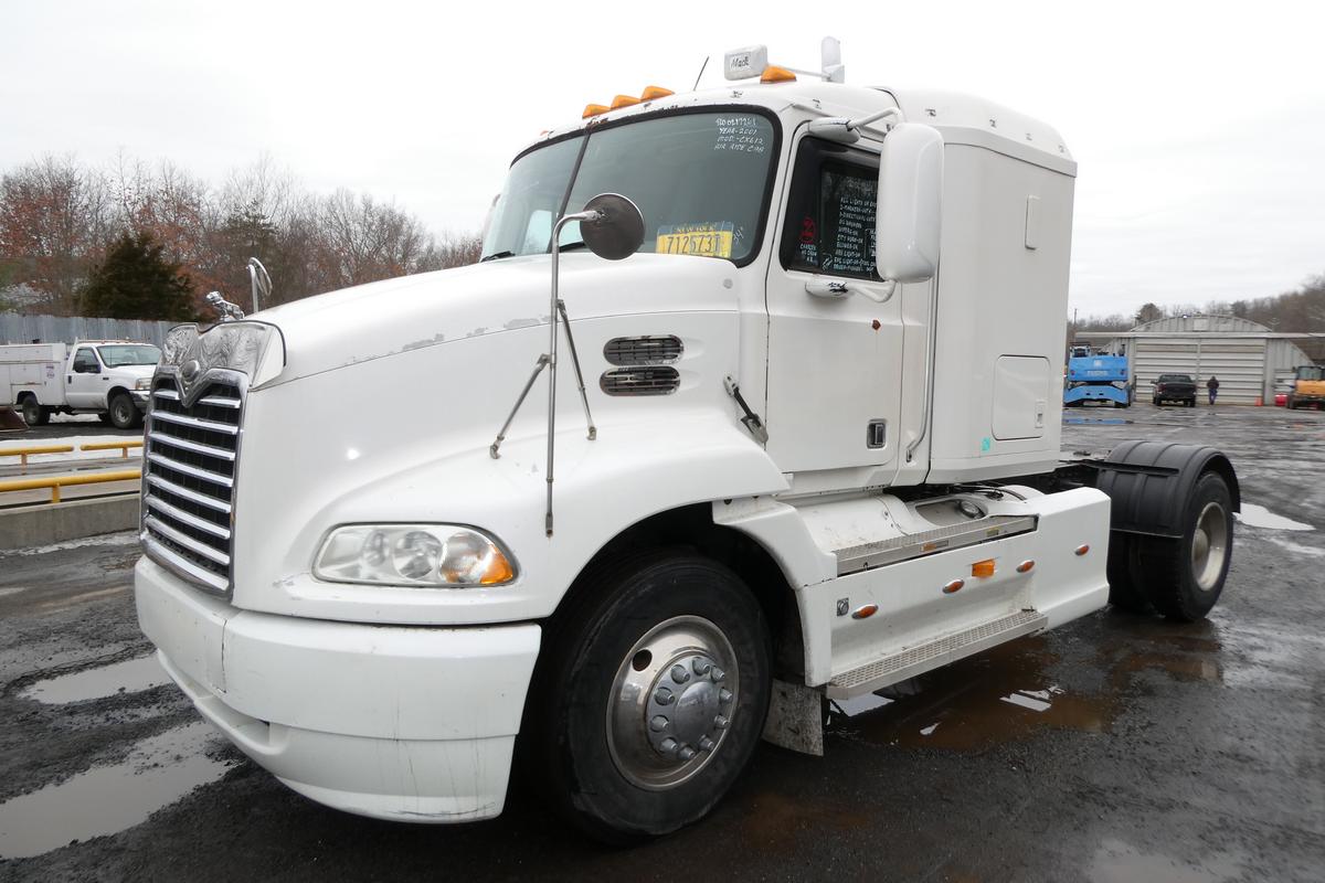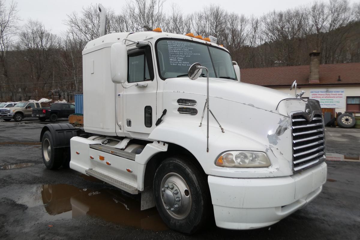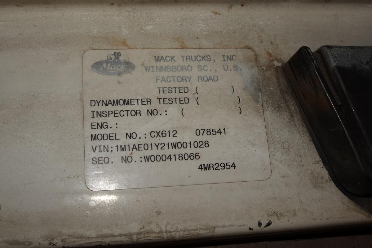 Inventory # 0217261Year: 2001 Make: Mack Model: CX612 Type: Single Axle Sleeper Cab Tractor VIN: 1M1AE01Y21W001028 Motor: Mack E7 Etech Elec 330/350 HP Air to Air: Yes Air Conditioning: Yes (Works) Engine Brake: Jake DEF: No Transmission: Fuller RTAO14710B-AS 10 Speed Automated Manual With Clutch PTO: No Wetline: No Front Axle: 12,000 lb Rear: Eaton 23,000 lb Ratio: 3.70 Power Divider: No Suspension: Mack 2 Air Bag 22,700 lb Tires: 295/75R22.5 Rims: 10 Bolt Hub Pilot - Steel Odometer Reading: 638,251 ECM: Hour Meter Reading: 24,464 Computer Hour Reading: Length: 22'9" Width: 8' Height: 10' Wheelbase: 186" Cab to Axle: 80" Cab to End: 110" Weight: 13,180 lb GVW: 34,700 lb Sleeper Details: Air Ride 42" Flat Top Sleeper Added Details: Runs Well, Single Frame, Trailer Ball Plate - RV / Camper Hauler, No 5th Wheel Assembly, No Trailer Air Lines, Hood Poor Price: $9,900 as described NNY 3RVXXTGIJJXXTRQPLKDPDFJJXRT+750+600 Terms of Sale