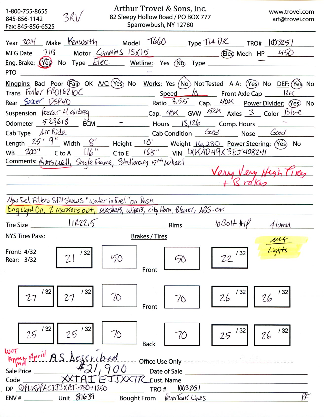 Inventory # 1003251Year: 2014 Make: Kenworth Model: T660 Type: Tandem Axle Day Cab Tractor VIN: 1XKAD49X3EJ408241 Motor: Cummins ISX 15.0L Elec 450 HP - Engine Light On Air to Air: Yes Air Conditioning: Yes (Not Working) Engine Brake: Electronic DEF: Yes Transmission: Fuller FRO16210C 10 Speed PTO: No Front Axle: 12,000 lb Rear: Spicer DSP40 40,000 lb Ratio: 3.55 Power Divider: Yes Suspension: Paccar 4 air bag 40,000 lb Tires: 11R22.5 Rims: 10 Bolt Hub Pilot - Aluminum Odometer Reading: 523,618 ECM: Hour Meter Reading: 18,126 ECM Hour Reading: Length: 25'9" Width: 8' Height: 10' Wheelbase: 200" Cab to Axle: 116" Cab to End: 168" Weight: 16,280 lb GVW: 52,000 lb Added Features: Runs Well - Engine Light On, Dash Shows "Water In Fuel" Still After New Fuel Filters, Single Frame, Stationary 5th Wheel Price: $21,900 WOT as described NNY 3RVXXTAIEJJXXTRQPLKDPACJJJXRT+750+1250 Terms of Sale